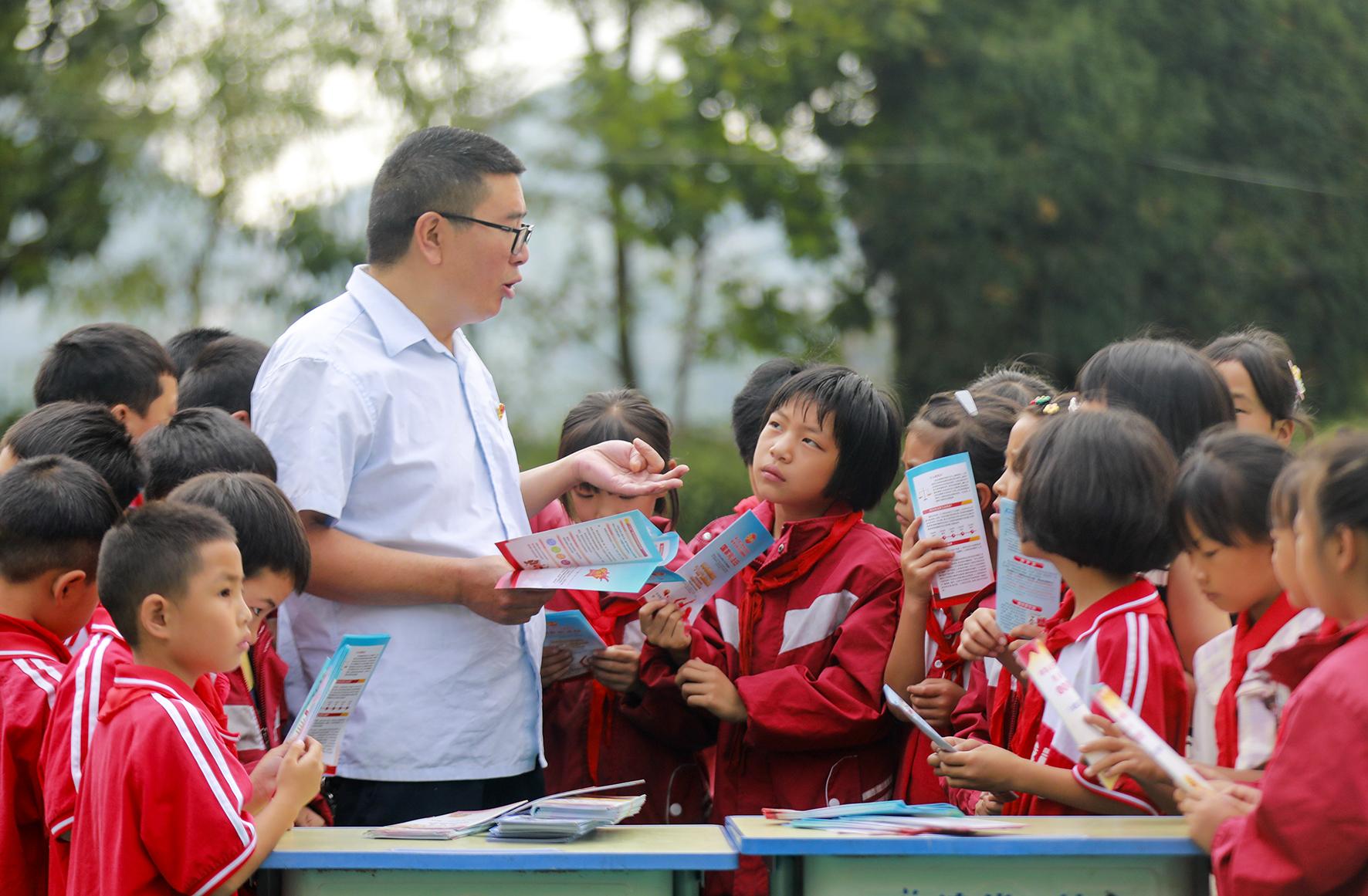9月18日,貴州省黔西市司法局司法工作者在偏遠的雨朵鎮(zhèn)龍場村龍場小學,給孩子們講解防范網絡謠言、防校園欺凌、反詐、禁毒等知識。