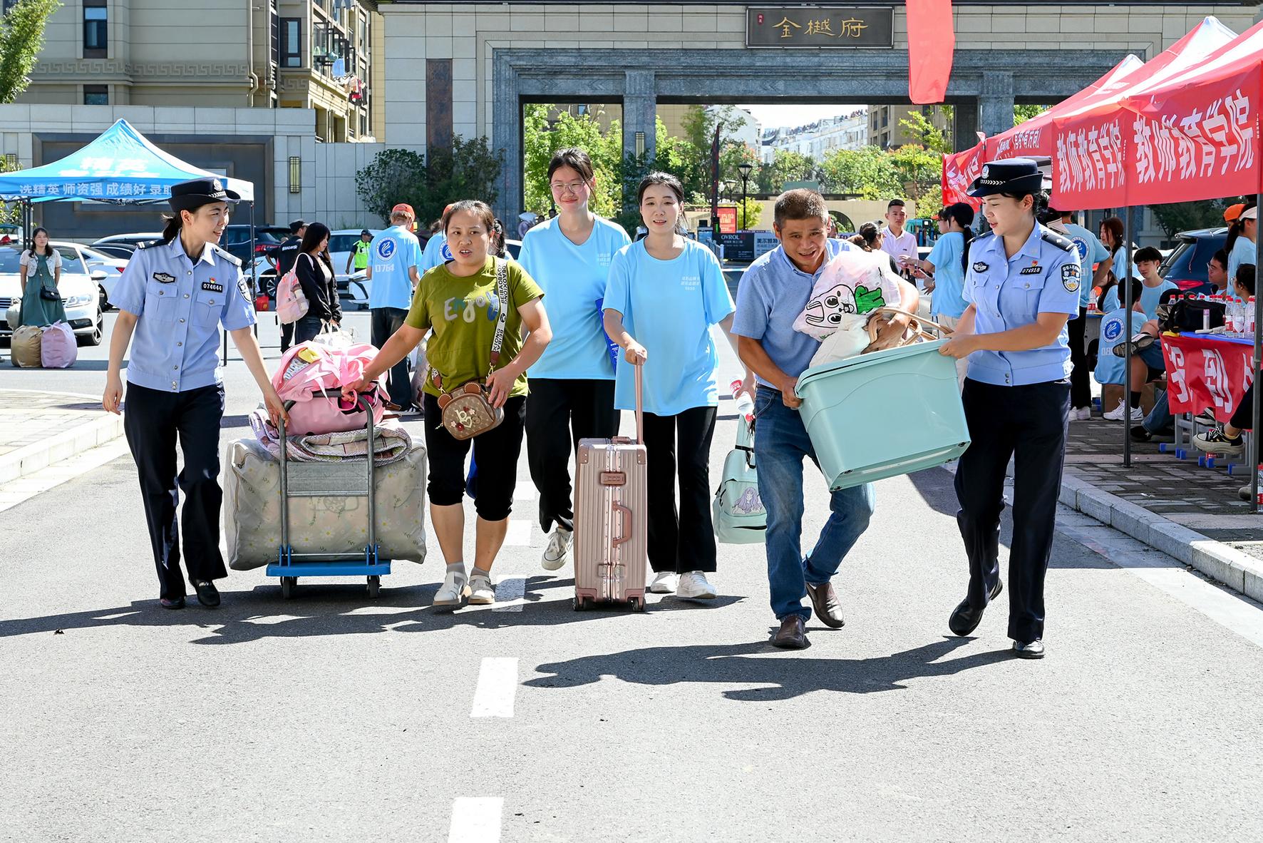9月18日,在安徽省馬鞍山師范高等??茖W(xué)校,和縣公安局歷陽(yáng)派出所民警正在幫助大一新生搬運(yùn)行李,并對(duì)新生及家長(zhǎng)開展反詐、禁毒普法宣傳。