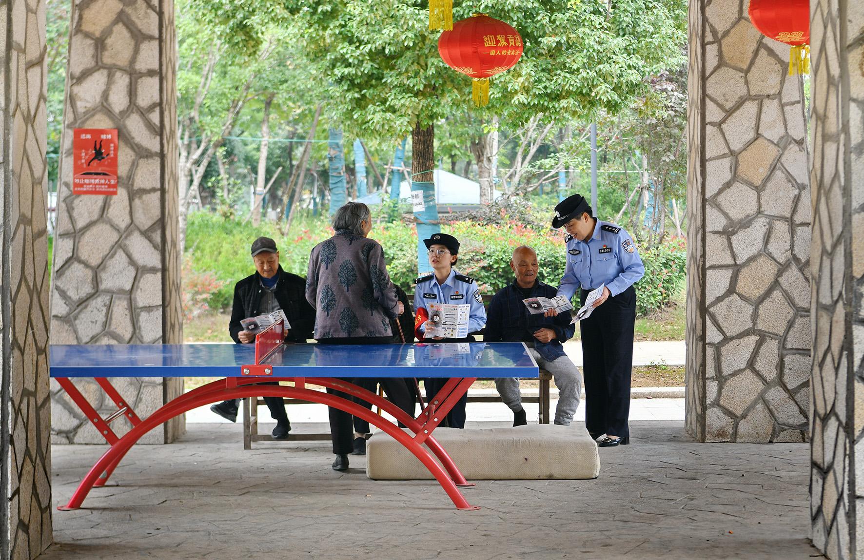 10月10日,安徽省阜南縣公安局治安大隊(duì)民輔警在鹿城鎮(zhèn)白果社區(qū)向居民們宣講防騙知識(shí)。