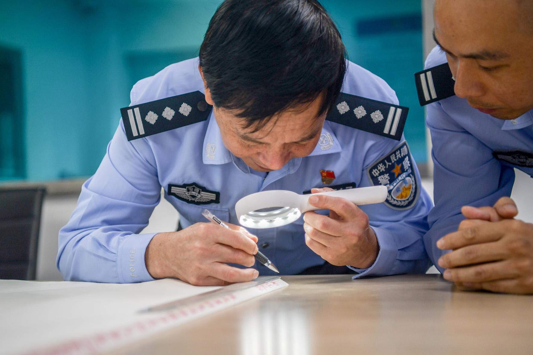 圖為10月11日,民警對假冒本土著名品牌宣紙的紋理、印刷、包裝工藝進(jìn)行勘驗。