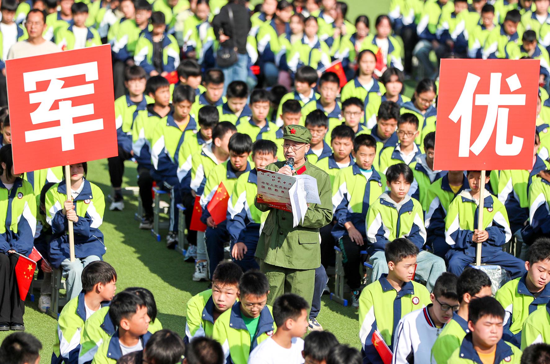 圖為10月15日,在華鎣二中國防教育法宣傳活動現(xiàn)場,戰(zhàn)斗英雄張昌仁向?qū)W生們講述自己保家衛(wèi)國的戰(zhàn)斗故事。