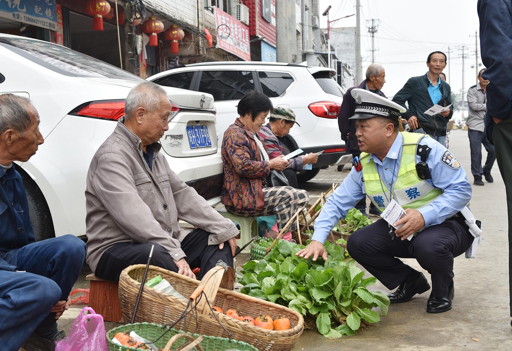 10月15日,安徽省宿松縣公安局交警大隊民輔警深入農村集鎮(zhèn),對二郎街路邊擺攤的菜農和商戶開展交通安全宣傳,提示擺攤時切勿占道影響交通通行和安全,并做好安全防護。