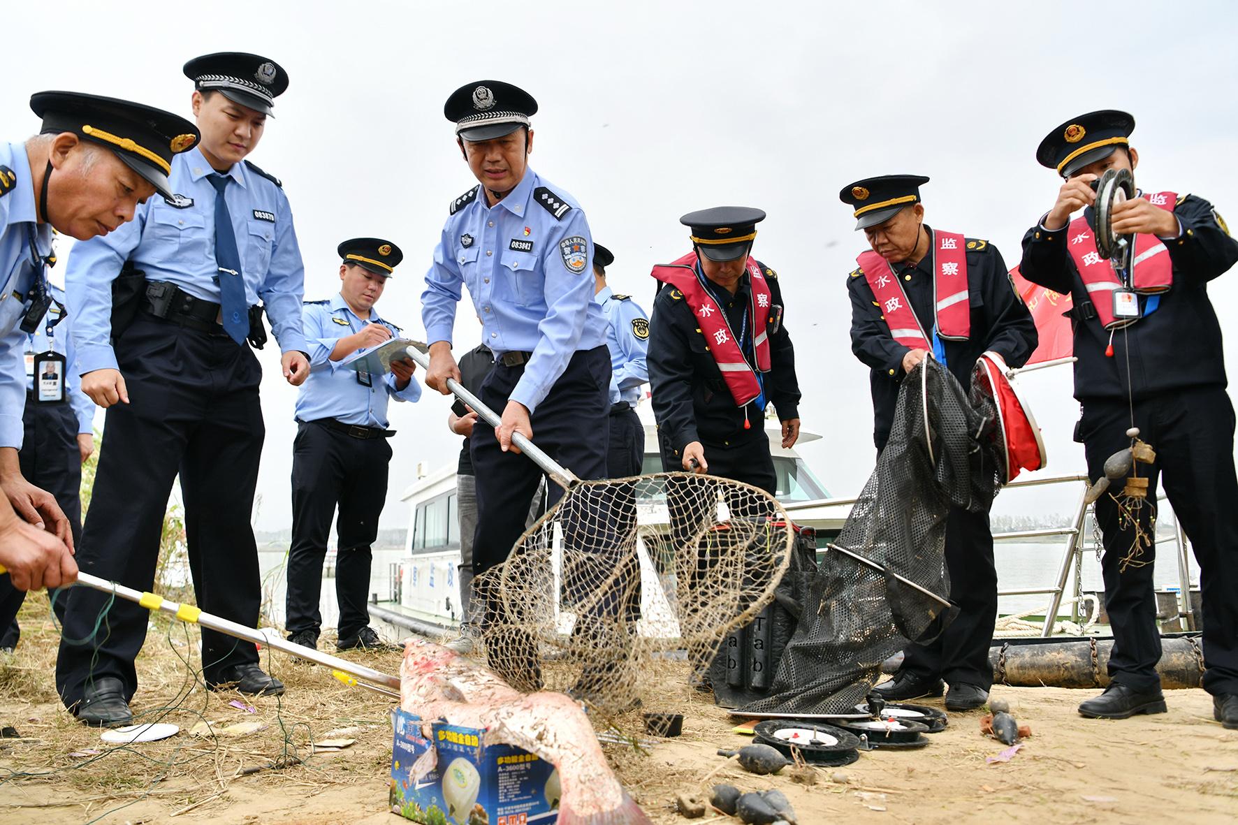 10月16日,安徽省阜南縣、霍邱縣和潁上縣的公安、農(nóng)業(yè)和水政等部門執(zhí)法人員在淮河霍邱縣流域一岸邊清點(diǎn)查獲的非法垂釣工具。為加強(qiáng)淮河橄欖蟶蚌保護(hù)區(qū)禁漁管理,阜南縣、霍邱縣和潁上縣公安、農(nóng)業(yè)和交通運(yùn)輸?shù)炔块T組織開展淮河橄欖蟶蚌保護(hù)區(qū)阜南郜臺段打擊非法垂釣聯(lián)合執(zhí)法專項行動,嚴(yán)厲打擊非法捕撈、非法垂釣,保護(hù)淮河生態(tài)環(huán)境及水生生物資源。