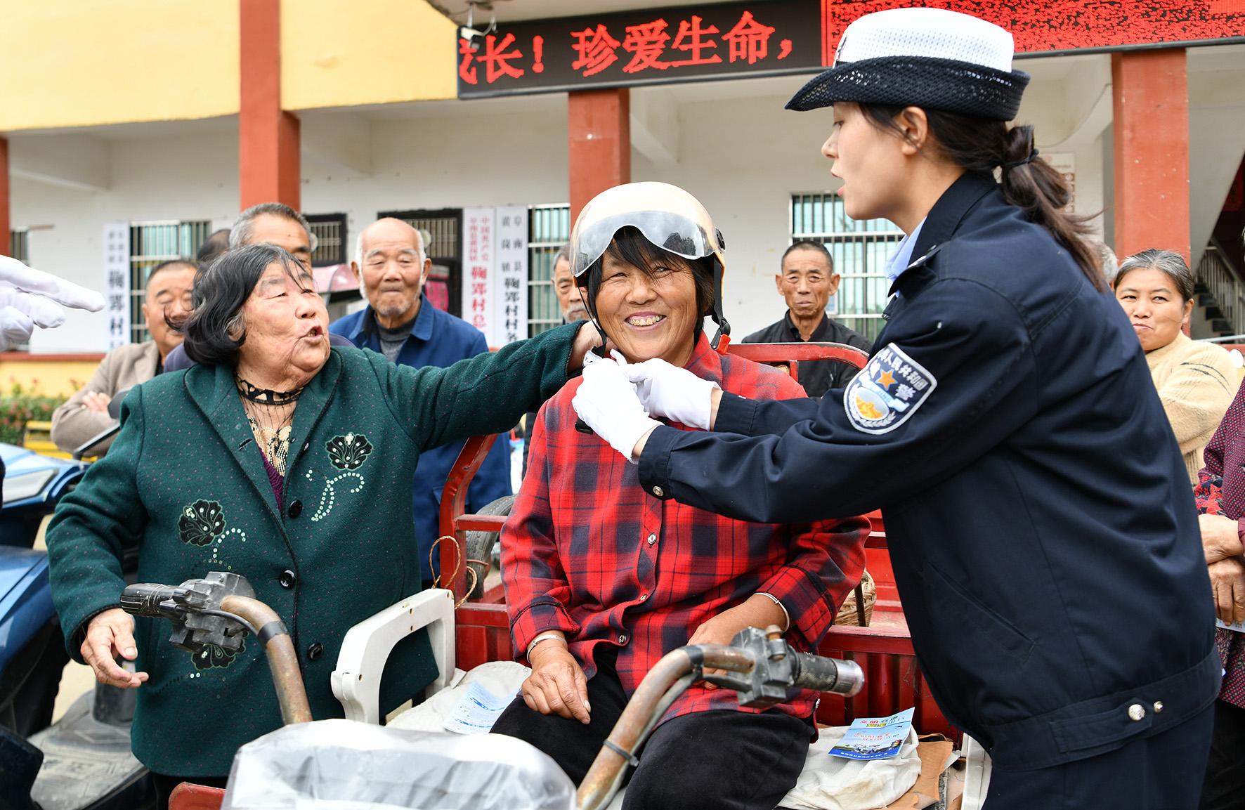 圖為民警在黃崗鎮(zhèn)鞠郢村指導(dǎo)村民正確佩戴安全頭盔。