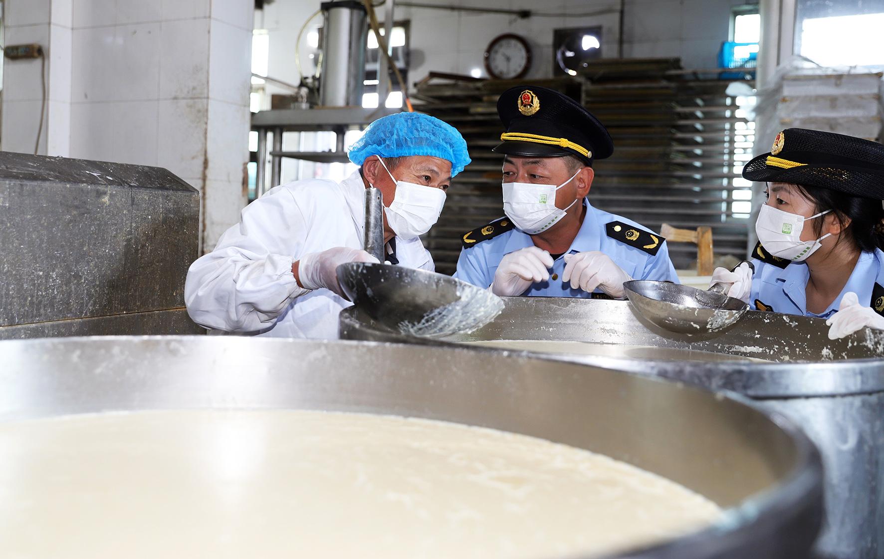10月23日,浙江省臺州市路橋區(qū)橫街鎮(zhèn)市場監(jiān)督管理所執(zhí)法人員在一家豆腐生產(chǎn)作坊檢查食品安全,向從業(yè)人員宣傳食品安全的相關(guān)法律法規(guī)。