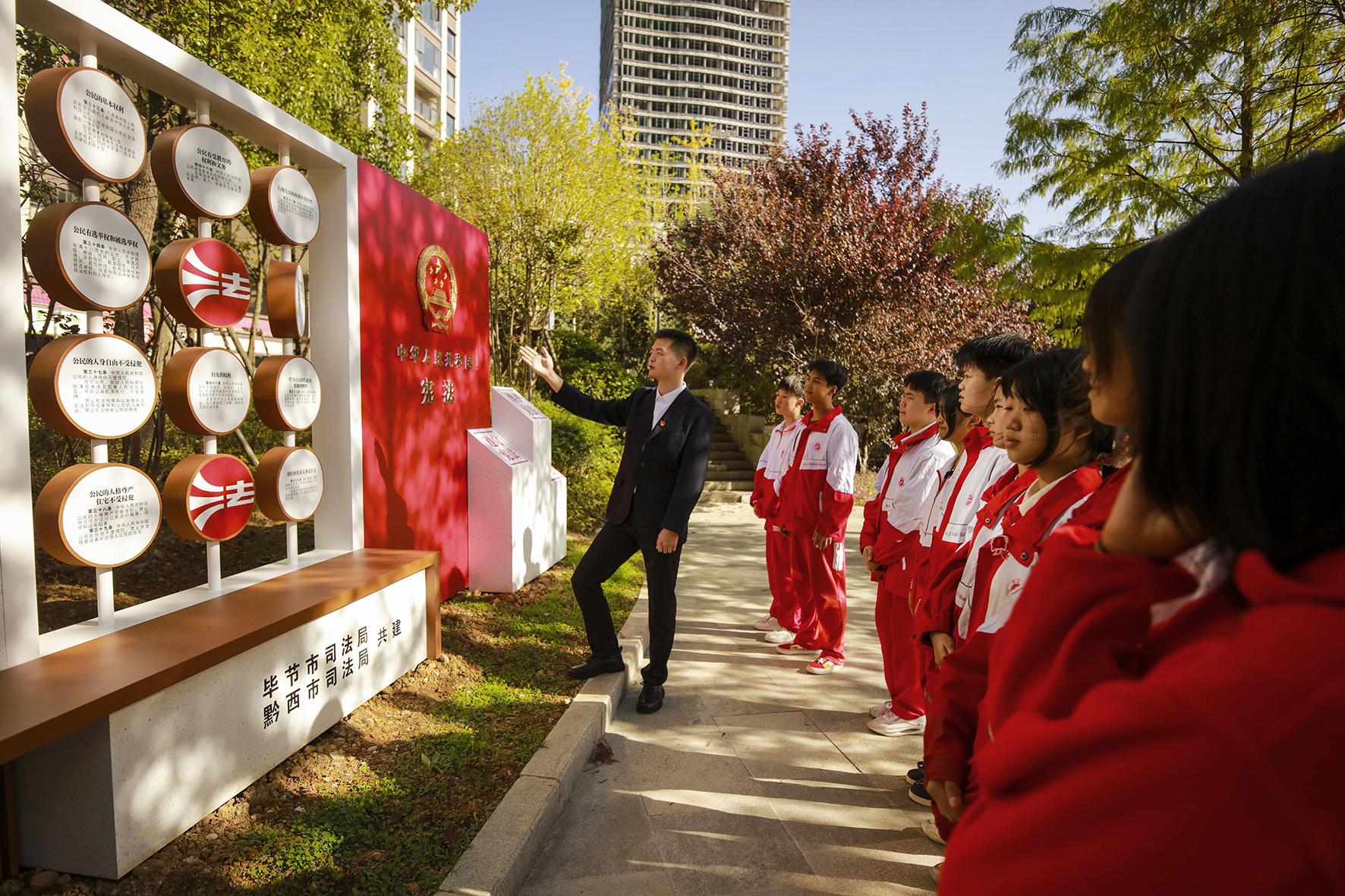 10月23日,貴州省黔西市第二中學(xué)的學(xué)生走進(jìn)蓮城街杜鵑湖法治公園,開展沉浸式學(xué)習(xí)法治知識(shí)。