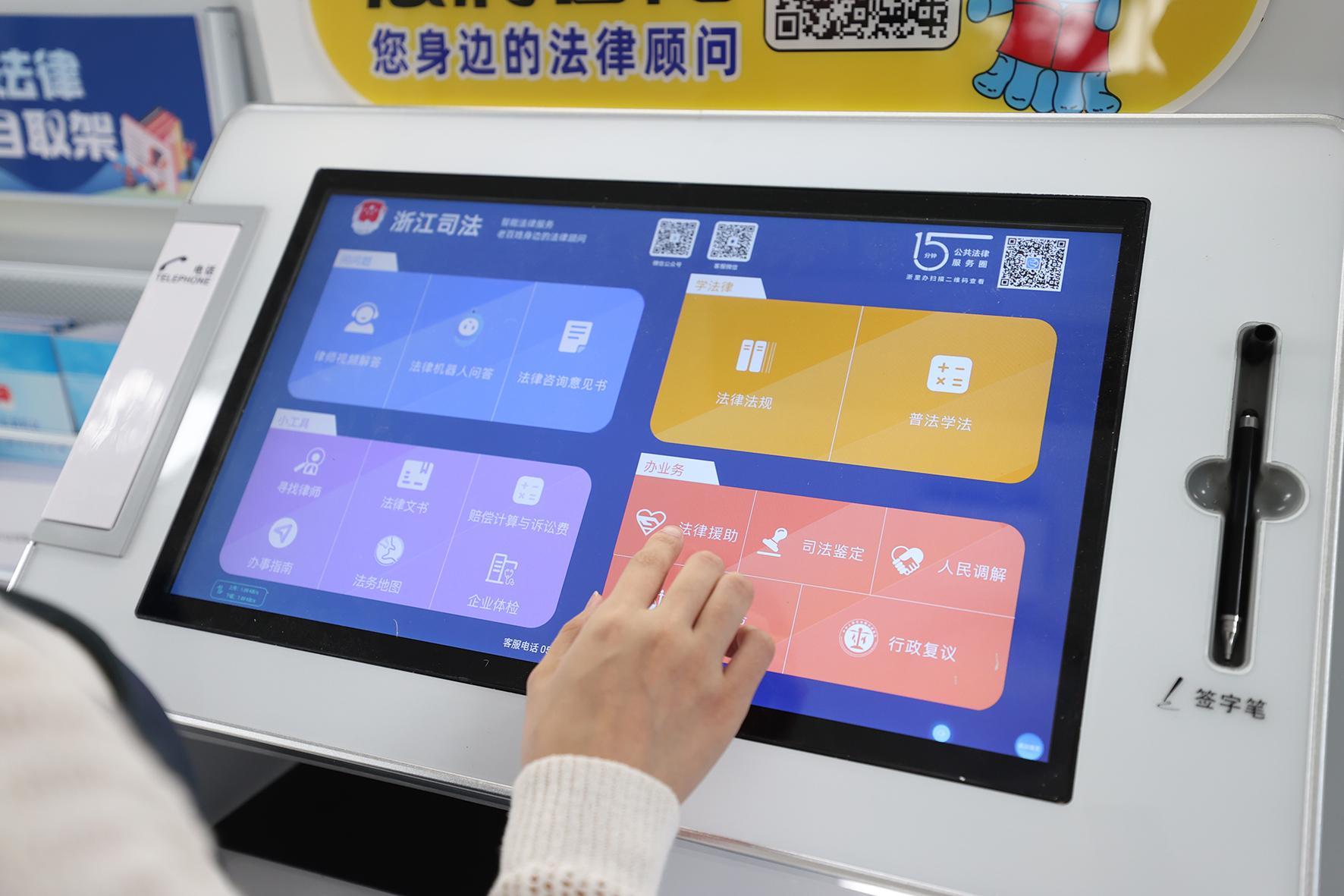 10月28日,浙江省舟山市普陀區(qū)市民正在24小時法超市內(nèi)使用公共法律服務(wù)自助機辦理相關(guān)業(yè)務(wù)。