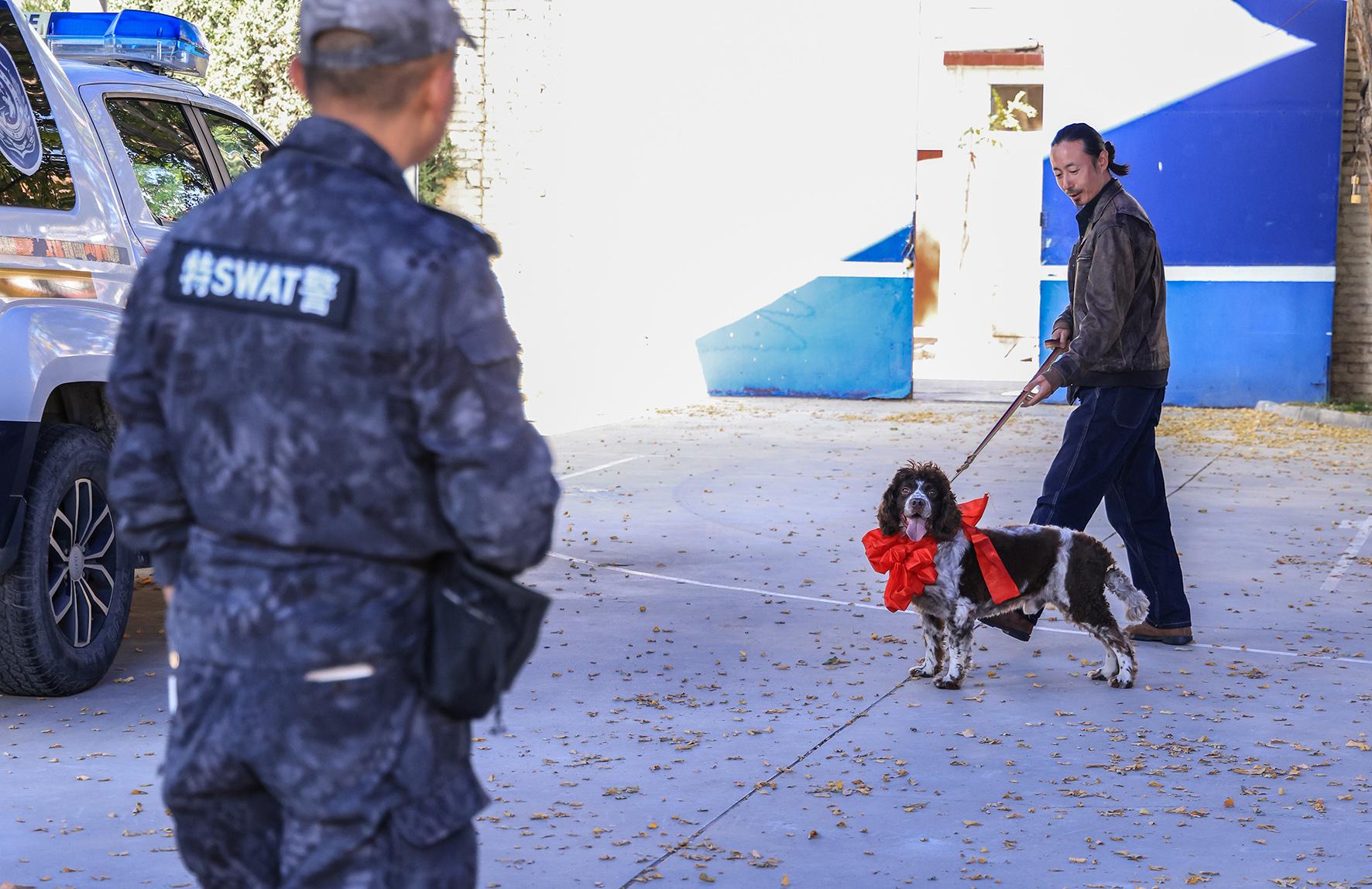 10月22日,在甘肅蘭州市公安局城關(guān)分局服役5年零9個(gè)月的警犬“山藥”退役被愛(ài)心人士領(lǐng)養(yǎng),大家為“山藥”舉行了簡(jiǎn)短的退役儀式。