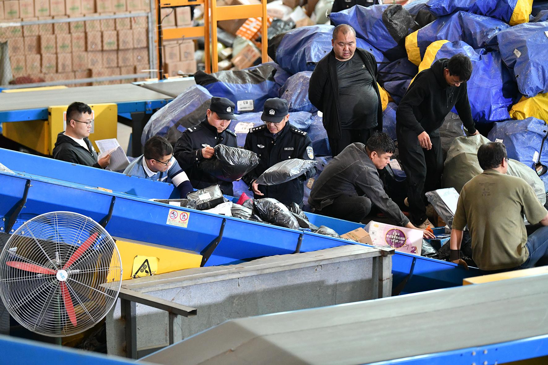 11月4日,安徽省阜南縣公安局經(jīng)開(kāi)區(qū)派出所民警在一快遞物流分揀中心進(jìn)行安全檢查。隨著“雙十一”臨近,阜南縣公安局經(jīng)濟(jì)開(kāi)發(fā)區(qū)派出所組織警力對(duì)轄區(qū)物流寄遞業(yè)的寄遞包裹實(shí)名登記、辦公場(chǎng)所的公共視頻及消防措施設(shè)置等進(jìn)行安全檢查,消除物流寄遞行業(yè)安全隱患。
