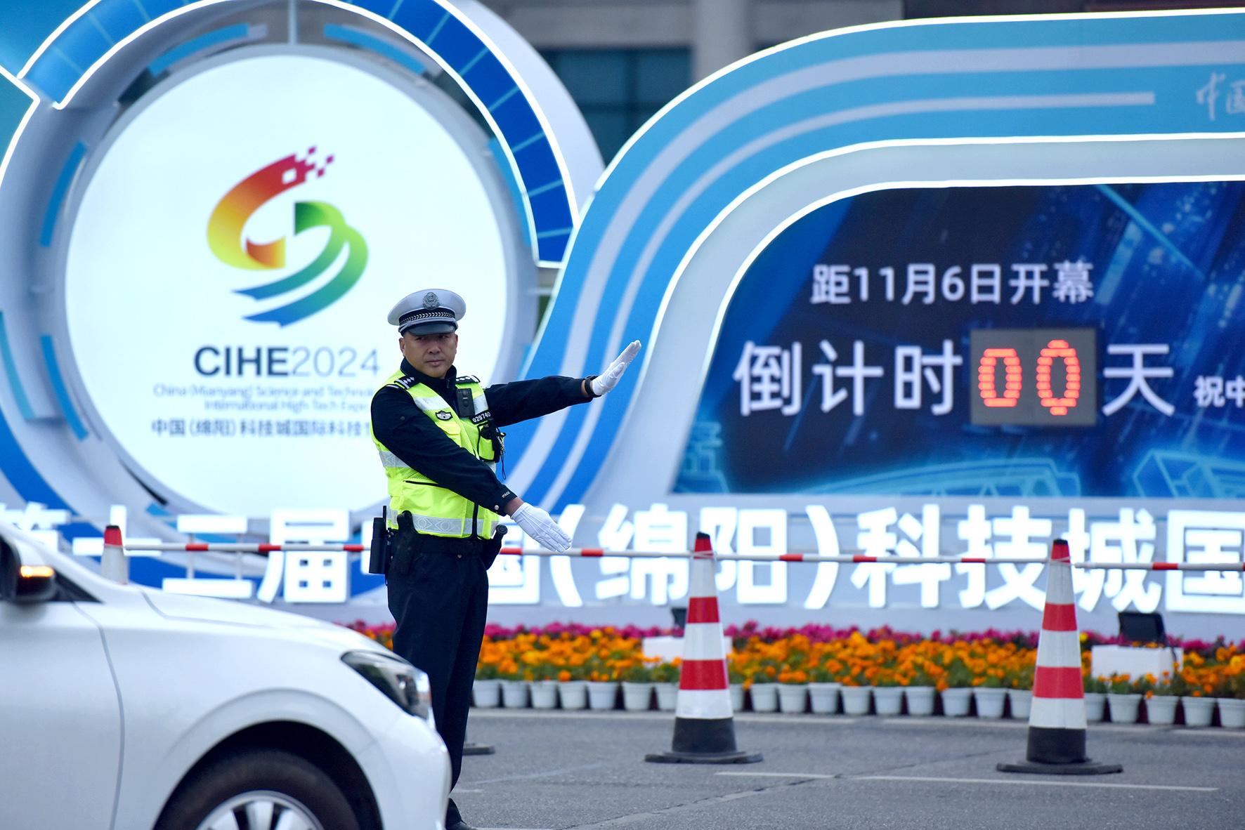 11月6日,第十二屆中國(綿陽)科技城國際科技博覽會開幕。四川省綿陽市公安局交警支隊直屬一大隊科學(xué)制定交通組織措施,全員上路指揮疏導(dǎo),確保道路交通安全暢通。