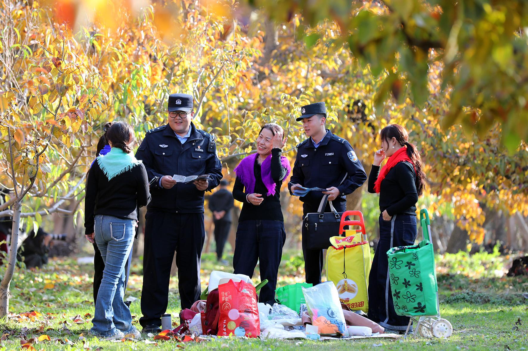 11月6日,甘肅省蘭州市皋蘭縣公安局什川派出所民警輔警走進(jìn)梨園,向游客普及安全防范知識(shí)。
