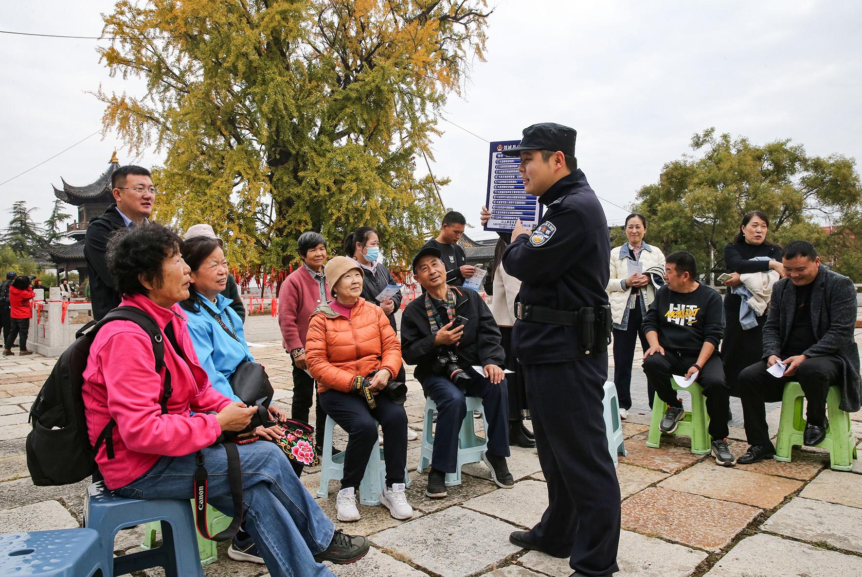 11月10日,山東省臨沂市郯城縣公安局新村派出所民警走進(jìn)新村三千年古銀杏樹(shù)景區(qū),向游客宣講反詐知識(shí)。