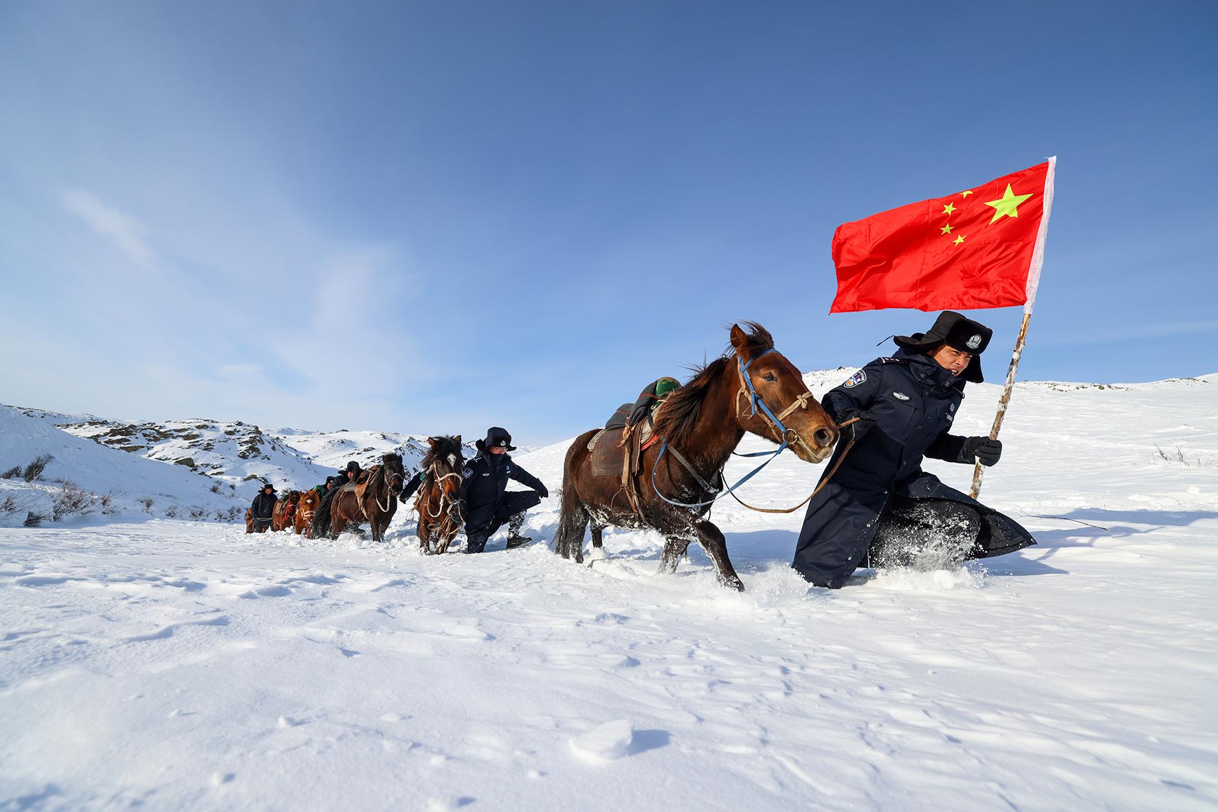 11月18日,新疆出入境邊防檢查總站阿勒泰邊境管理支隊加郎阿什邊境派出所民輔警前往邊境一線開展踏雪巡邊。