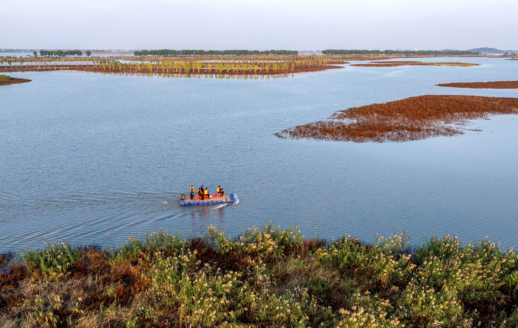 11月21日,安徽省合肥市廬江縣環(huán)境保護執(zhí)法人員在黃陂湖濕地開展水上巡查。