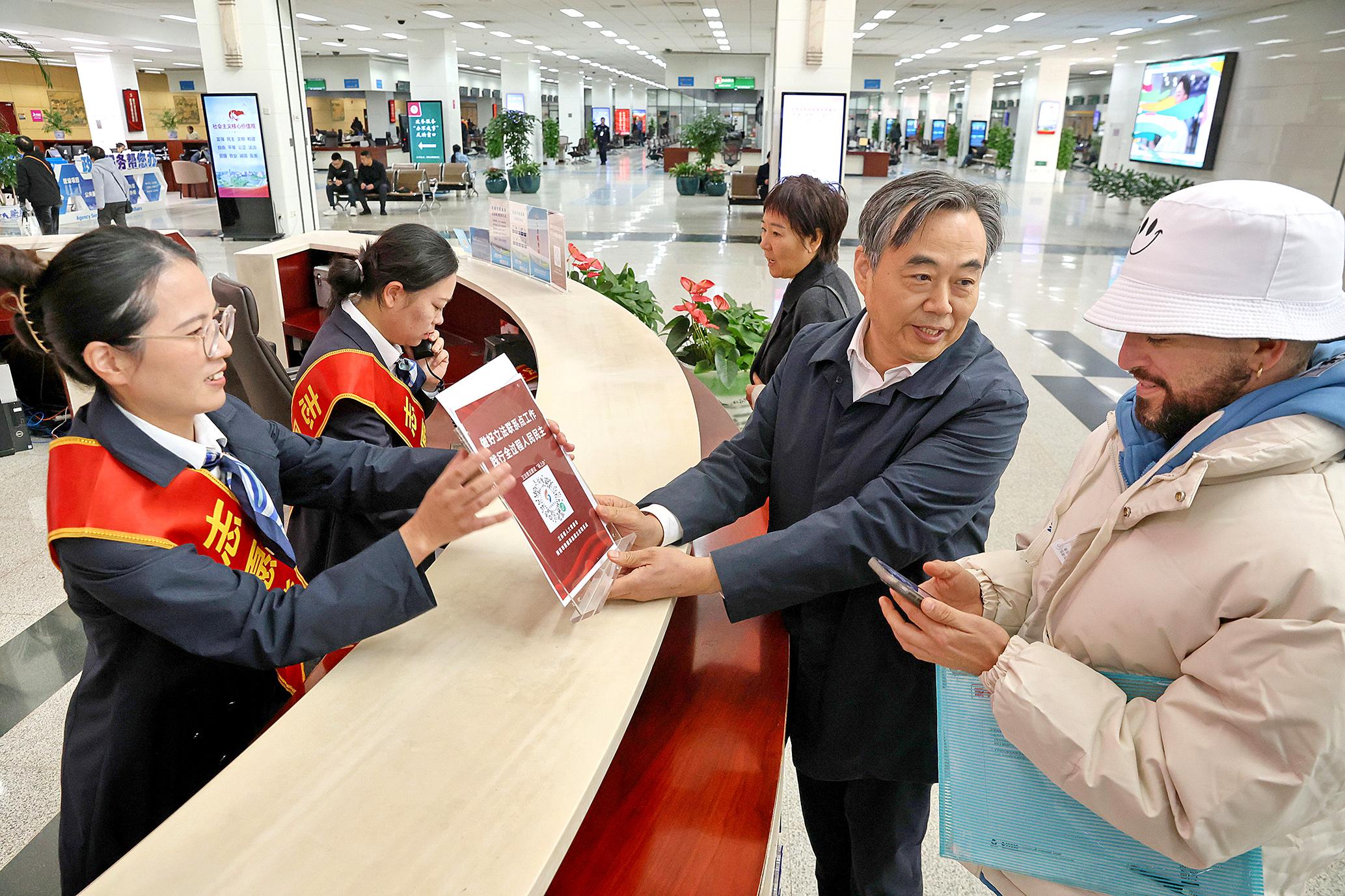 圖為工作人員在南通市政務(wù)服務(wù)中心立法聯(lián)系點(diǎn)宣傳“立法我參與”小程序。