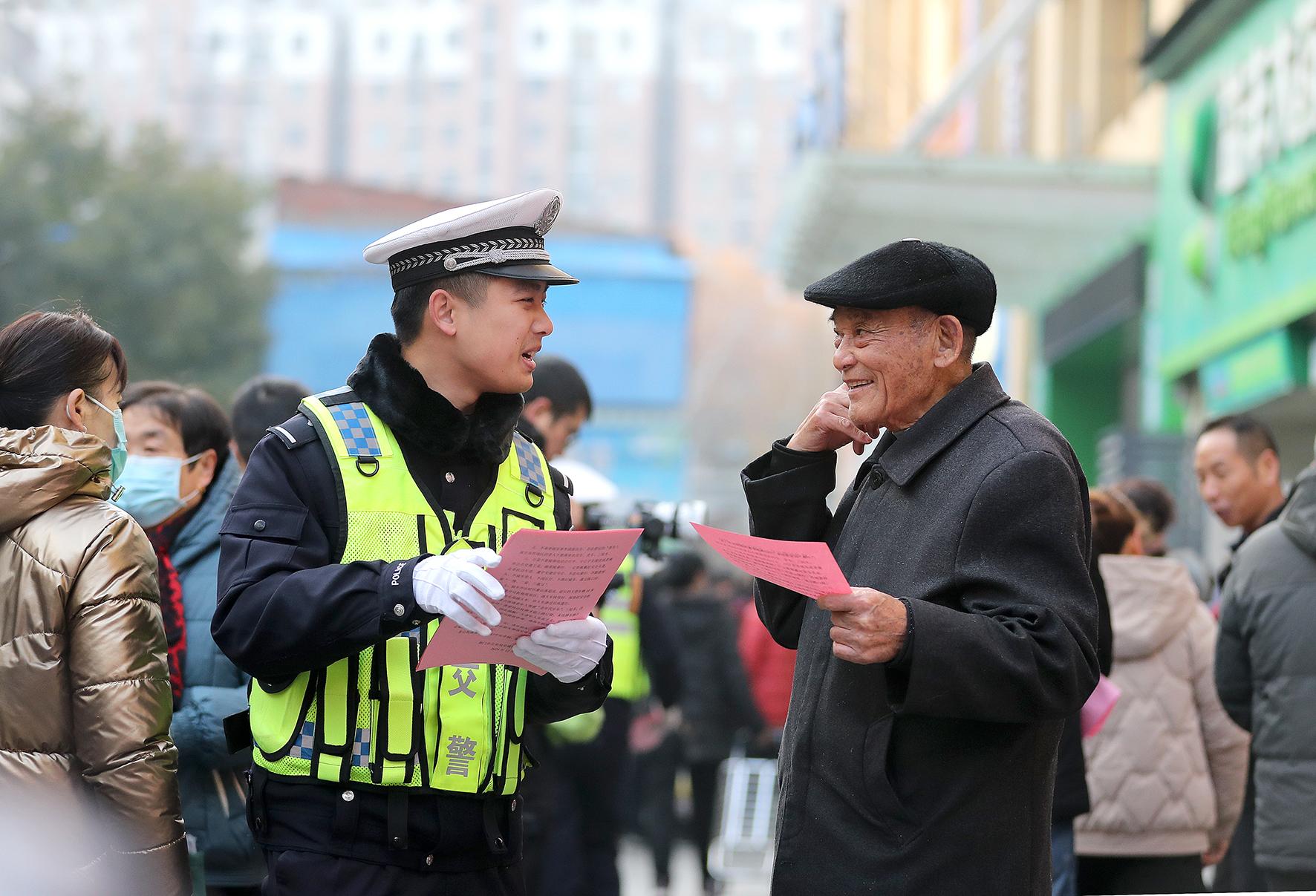 12月13日,湖北省荊門市公安局交警支隊(duì)東寶大隊(duì)民警在南臺(tái)菜市場(chǎng),將《致老年交通參與者一封信》逐句地念給老年人聽(tīng),倡議老年朋友們自覺(jué)遵守交通法規(guī),平安出行。