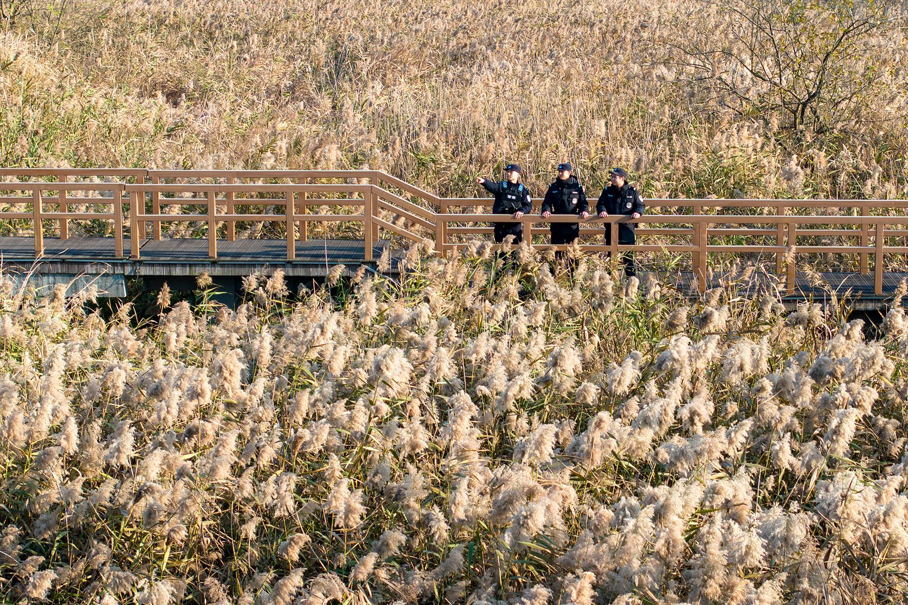 12月16日,浙江省臺州市公安局黃巖分局江口派出所民警在三江口濕地巡邏。近年來,黃巖警方在濕地設置生態(tài)警務室,建立天網(wǎng)探頭、無人機巡邏和警力巡邏相結(jié)合的“生態(tài)警務”立體屏障,守護濕地的生態(tài)安全。