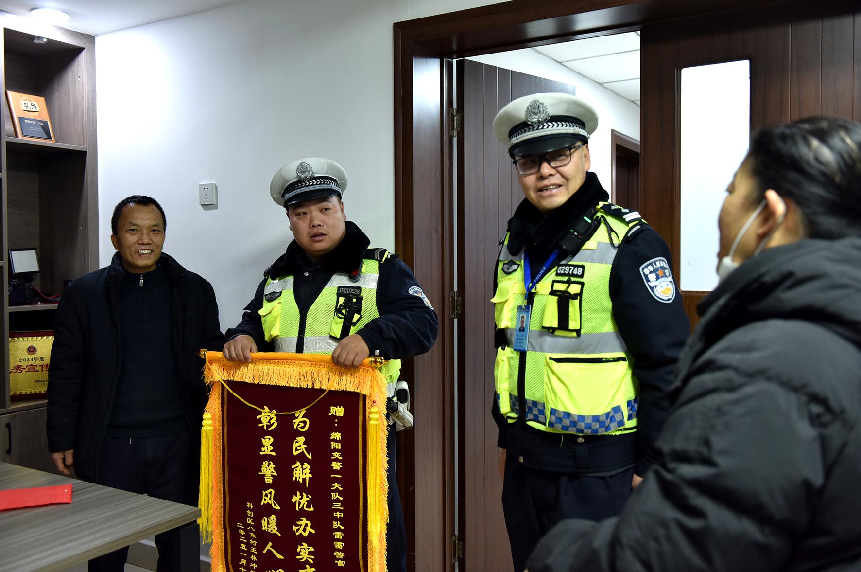 1月10日,第五個(gè)中國人民警察節(jié)。一對(duì)中年夫婦手拿錦旗走進(jìn)了四川省綿陽市公安局交警支隊(duì)直屬一大隊(duì),感謝民輔警巡邏時(shí),將80多歲、迷路的父親安全送回家中。