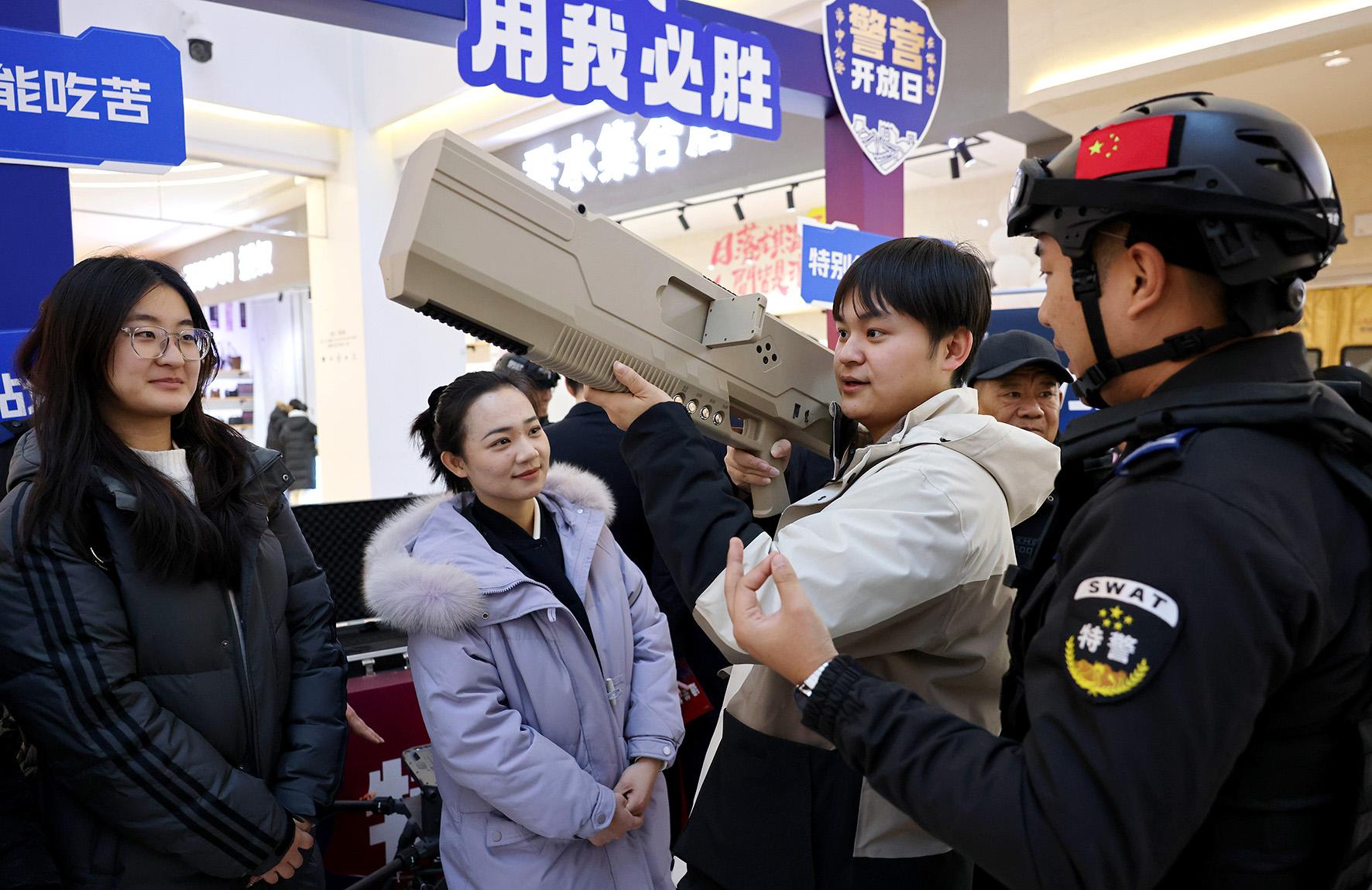1月10日,第五個(gè)中國人民警察節(jié)。山東省棗莊市公安局警營開放日活動(dòng)現(xiàn)場(chǎng),市民在體驗(yàn)警用裝備。