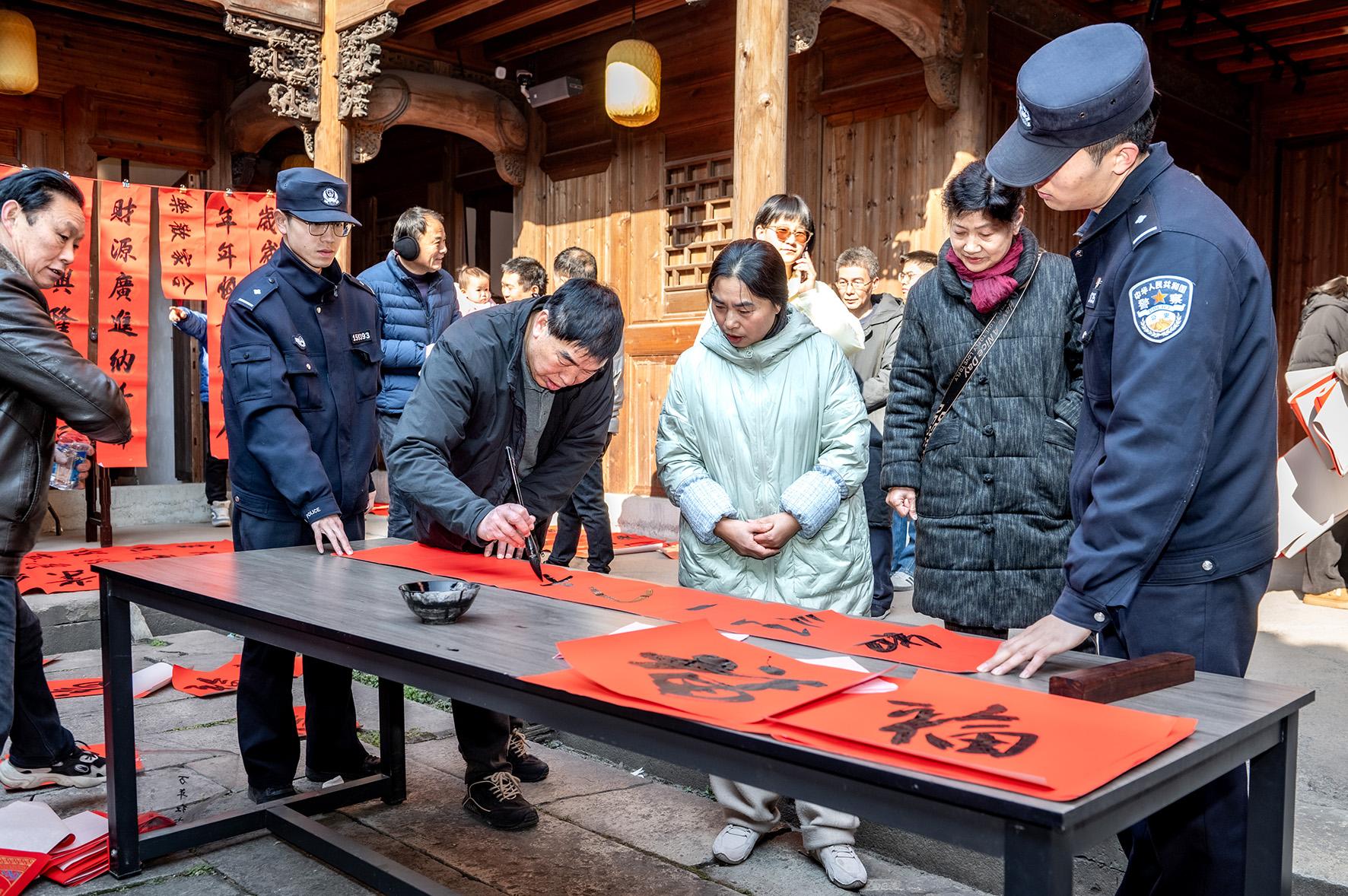 1月12日,浙江省武義縣公安局壺山派出所聯(lián)合當(dāng)?shù)匚幕^、書法家協(xié)會(huì)開(kāi)展“寫春聯(lián) 送平安”活動(dòng),為群眾送上平安祝福。