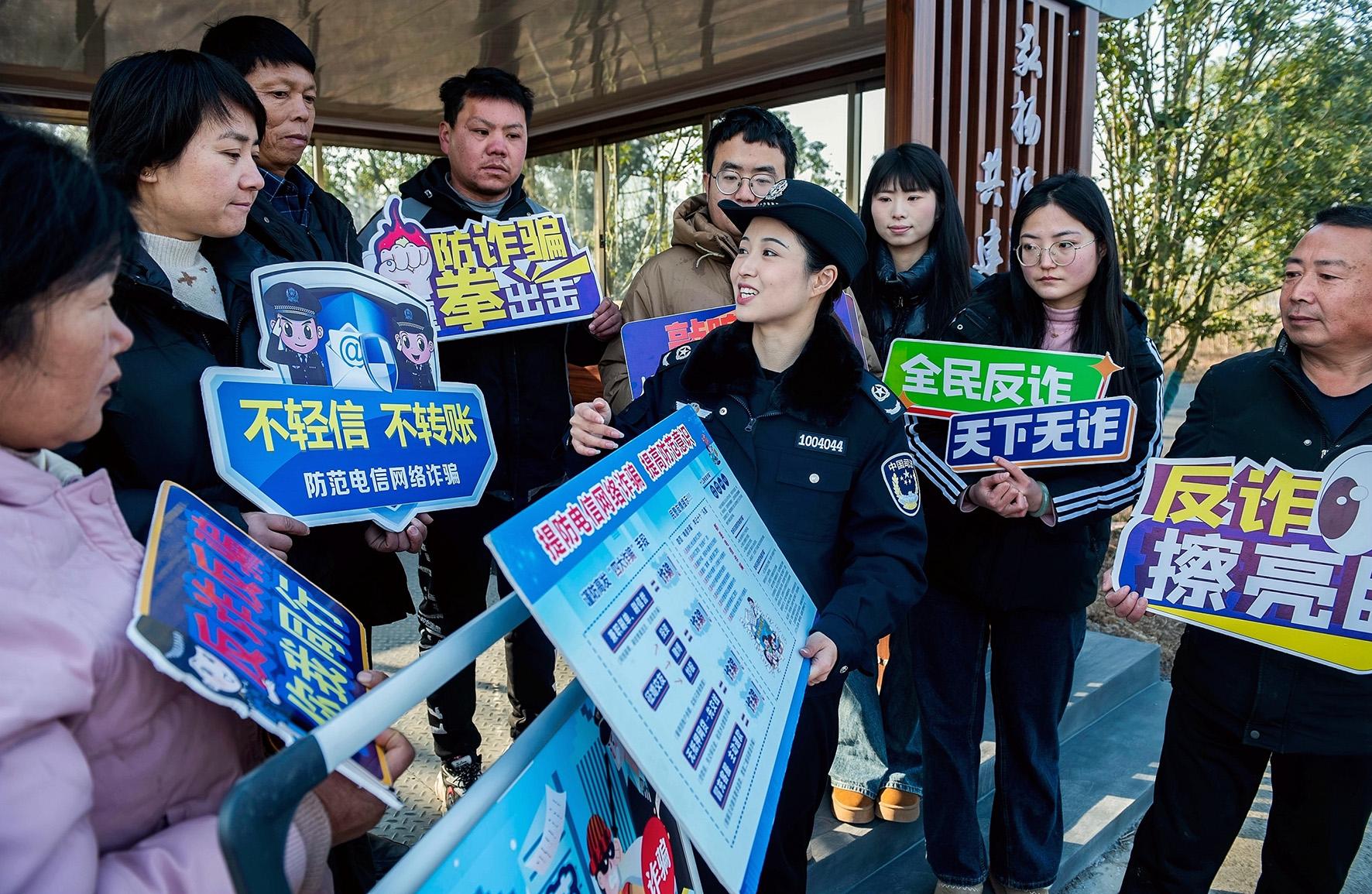 1月13日,安徽省含山縣司法局普法工作者在凌家灘景區(qū)向游客宣傳防范網(wǎng)絡(luò)電信詐騙知識(shí)。年關(guān)將至,含山縣司法局組織開展“全民反詐同行 共筑平安家園”主題宣傳活動(dòng)。