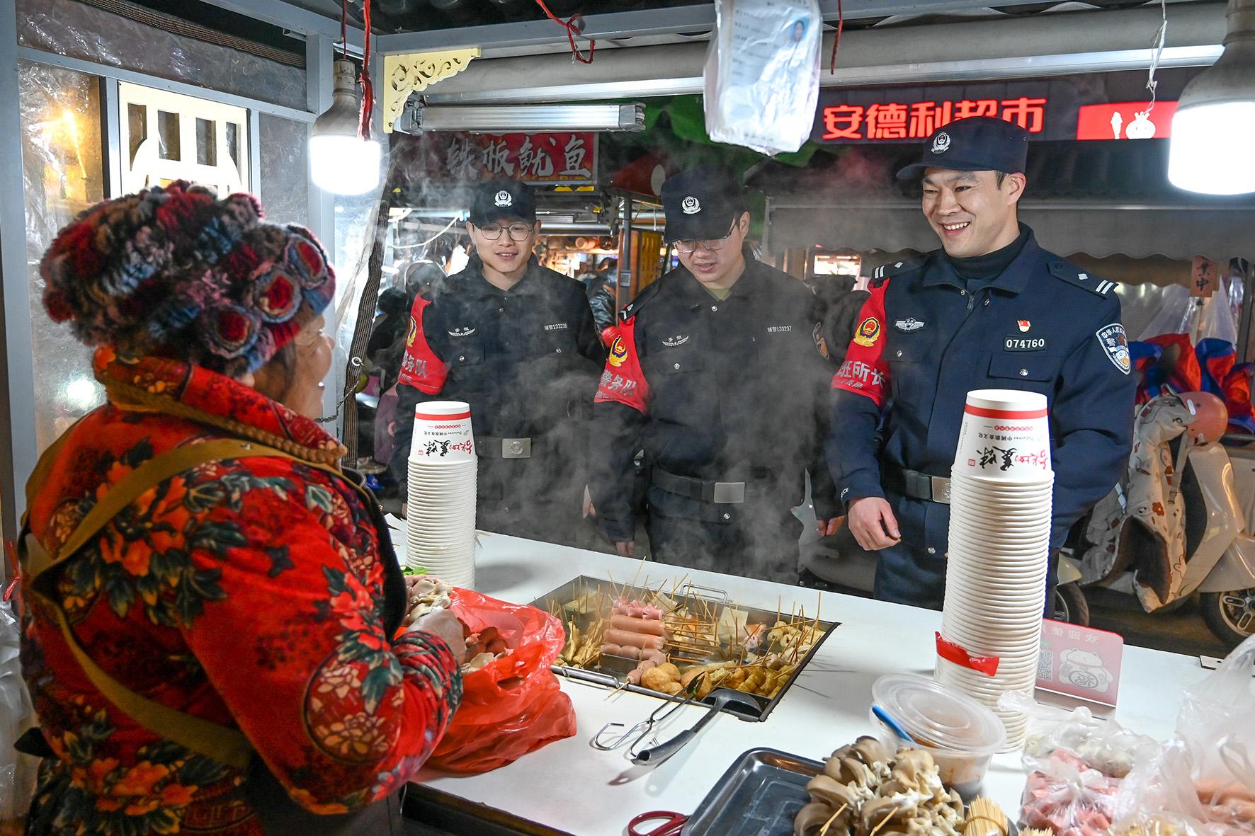 1月13日晚,安徽省馬鞍山市和縣公安局民警在美食街開(kāi)展徒步巡邏,走訪經(jīng)營(yíng)戶了解治安狀況,守護(hù)夜市平安。