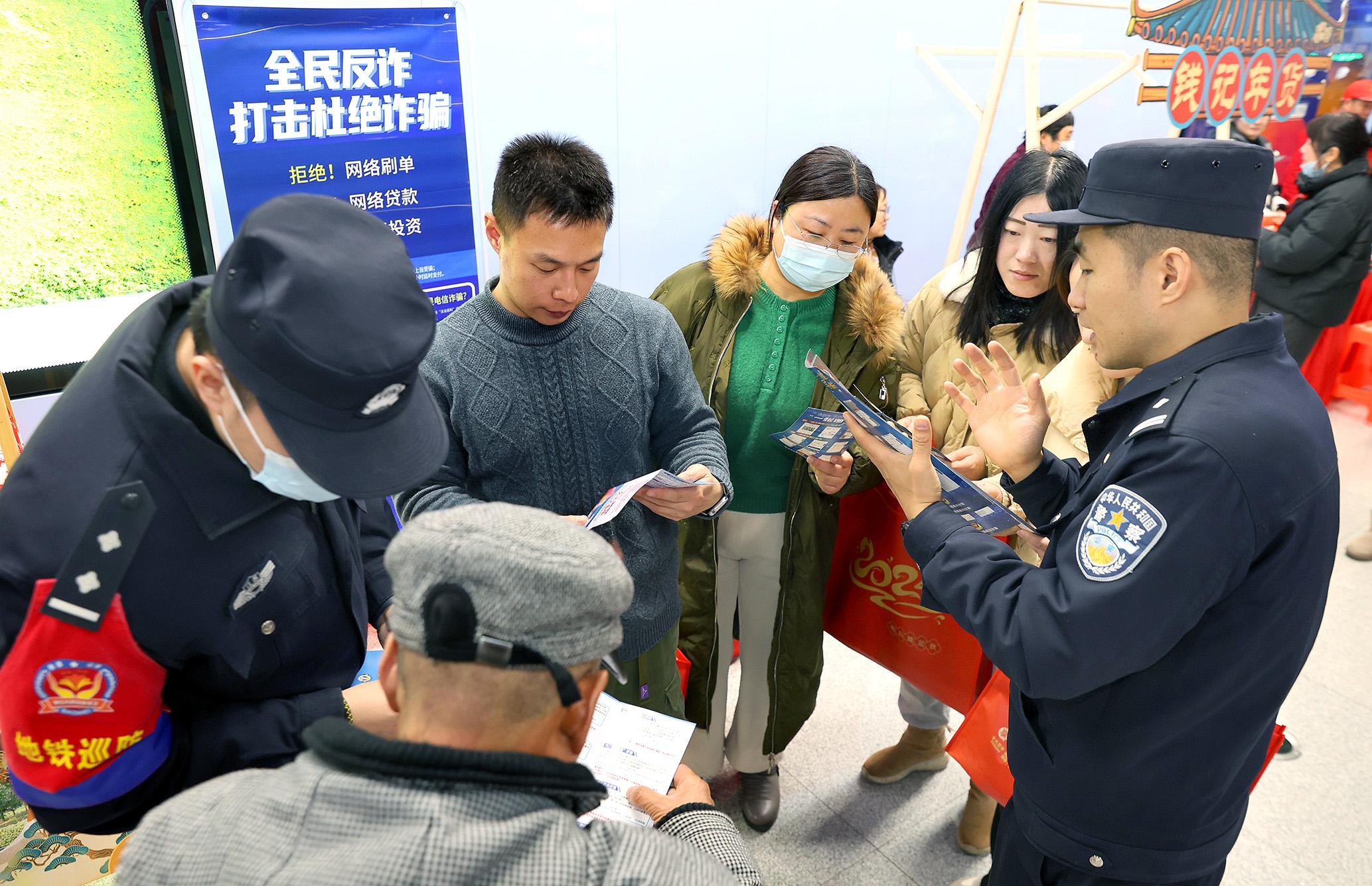 1月21日,江蘇省南通市公安局民警在地鐵2號線幸福站向市民進行反詐宣傳。