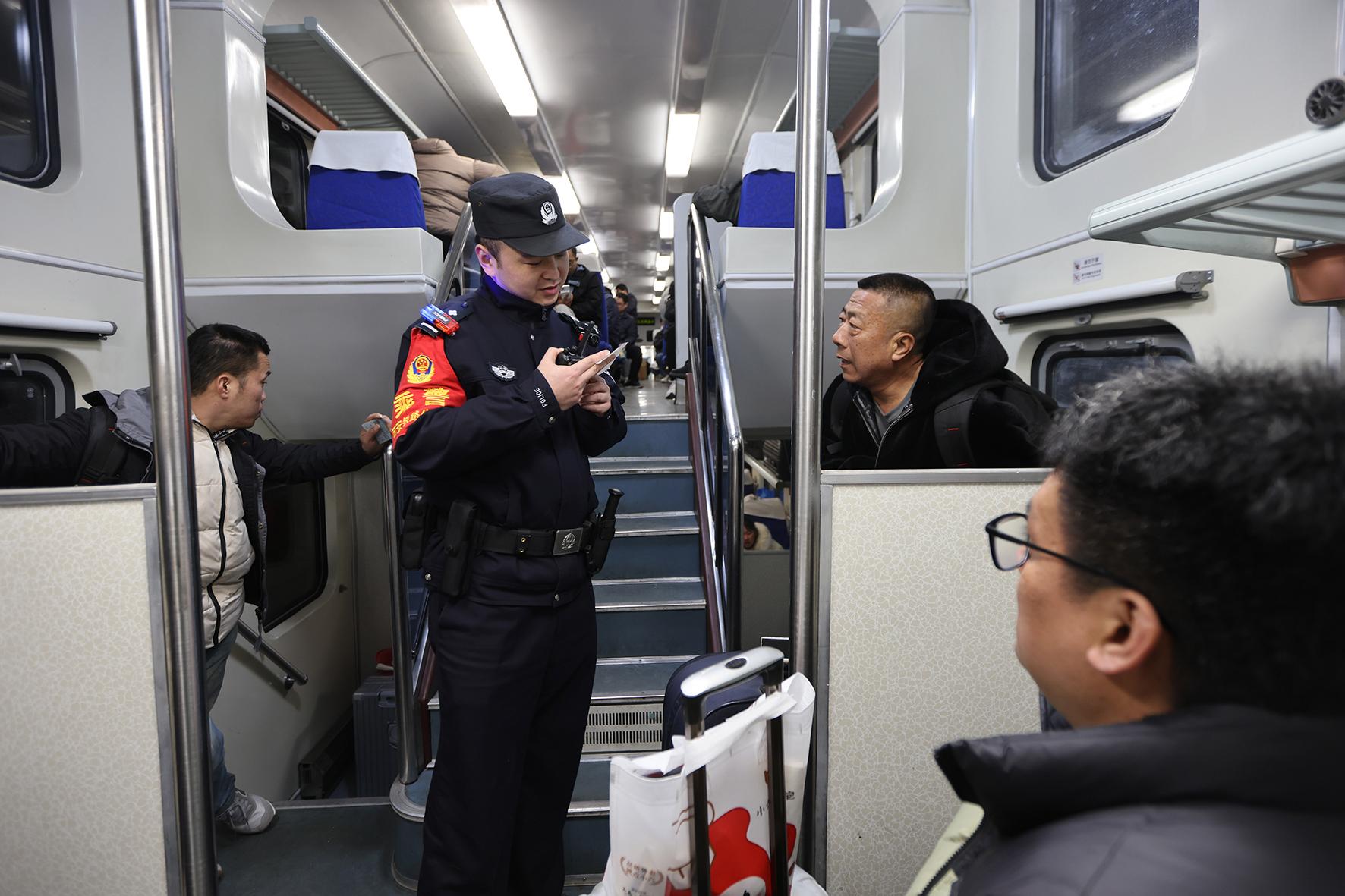 在K1002次列車上,乘警李軼豪在車廂核實(shí)信息幫助旅客尋找座位。