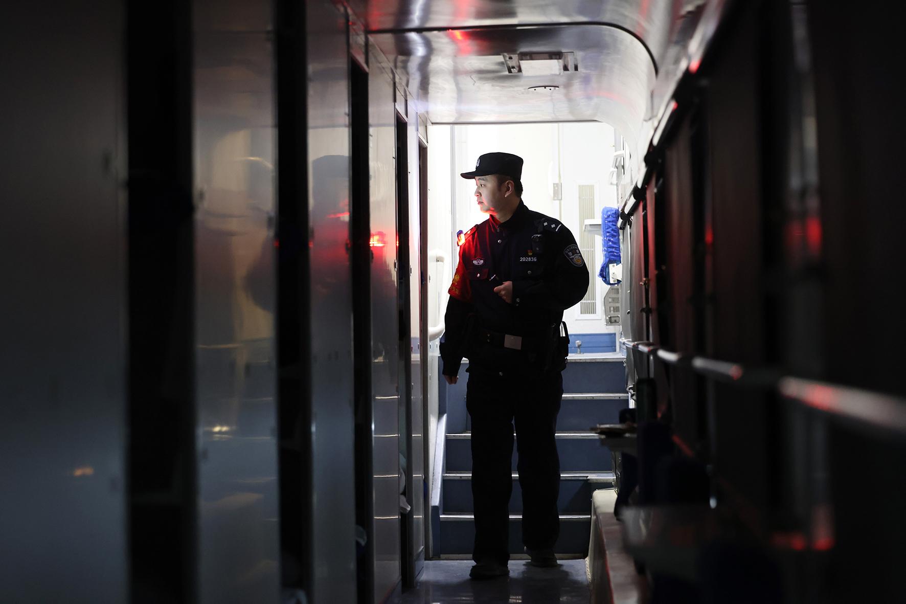 乘警李軼豪對(duì)臥鋪車廂開展安全巡視。