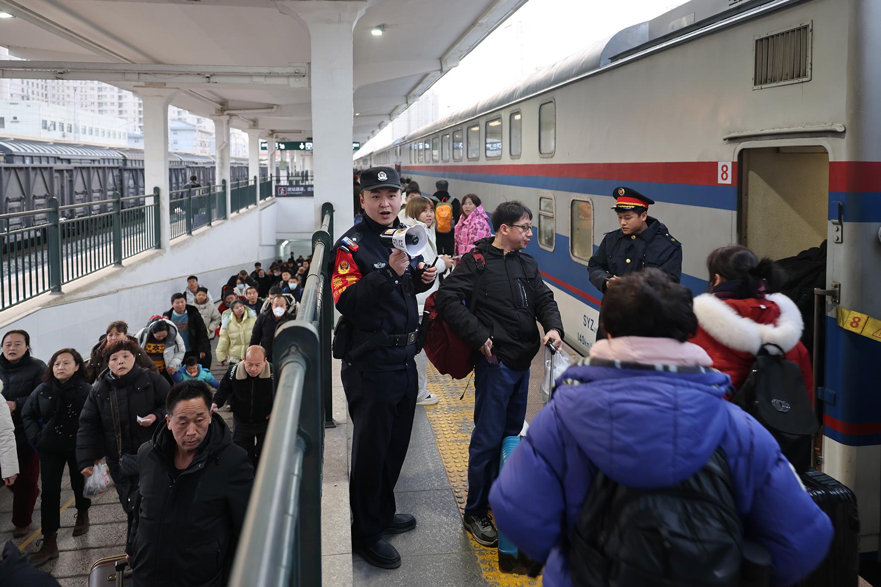 在陜西省寶雞火車站,乘警李軼豪在站臺(tái)上疏導(dǎo)客流。