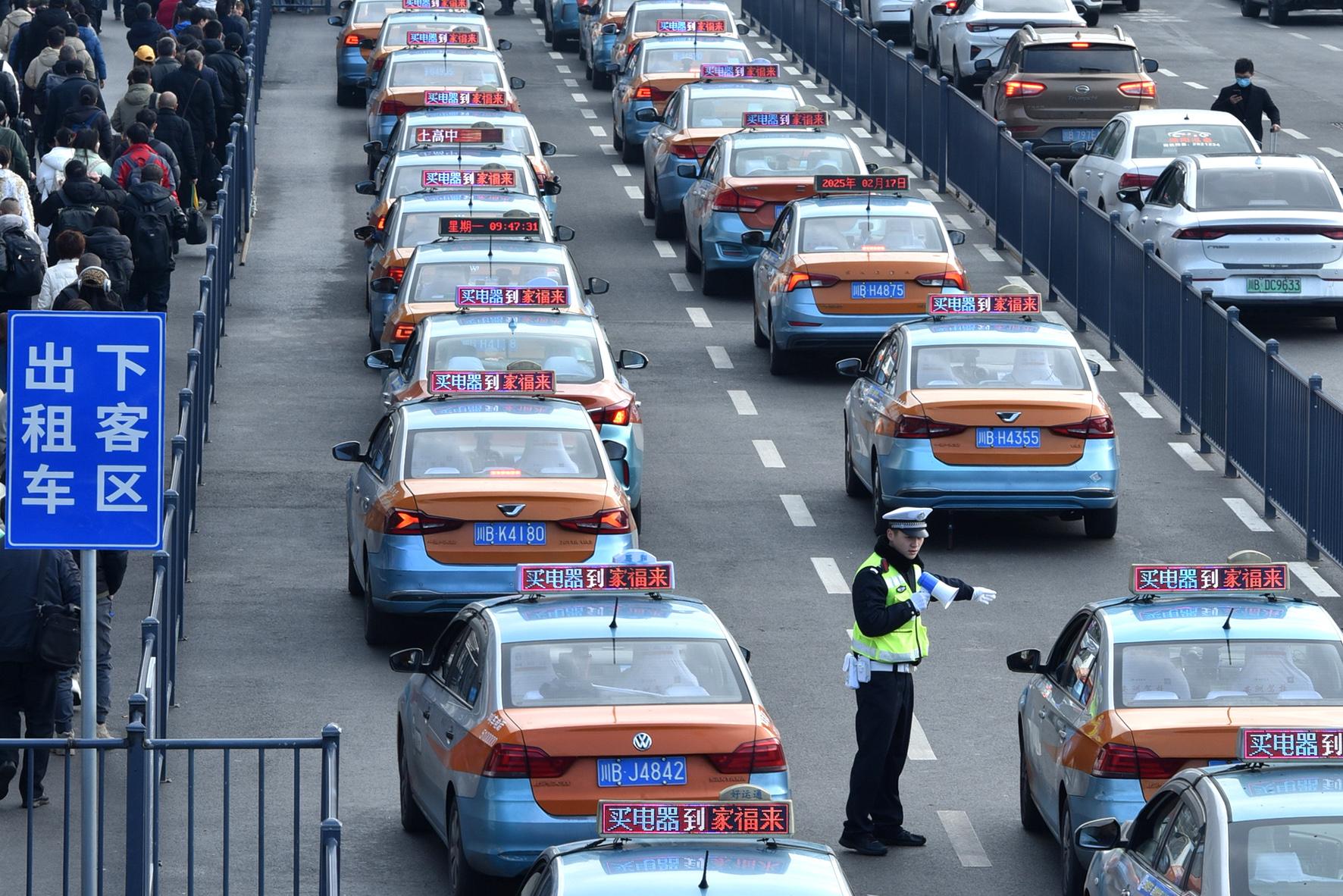 圖為2月17日,民輔警在火車(chē)站廣場(chǎng)外指揮疏導(dǎo)行人和車(chē)輛。