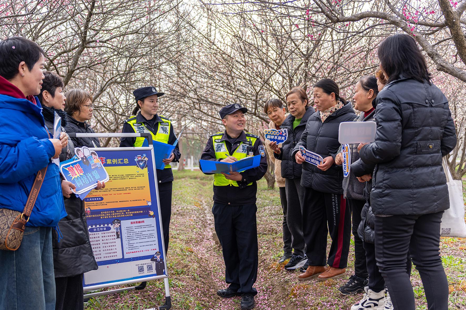 3月11日,上海市公安局崇明分局長江派出所民警來到轄區(qū)梅花公園,向游客開展防范電信網(wǎng)絡(luò)詐騙宣傳。