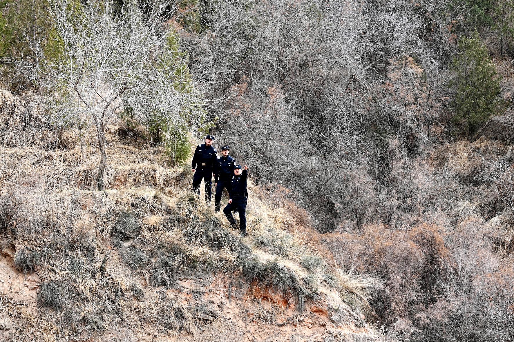 圖為3月11日,安寧派出所民警在仁壽山踏查林區(qū)。