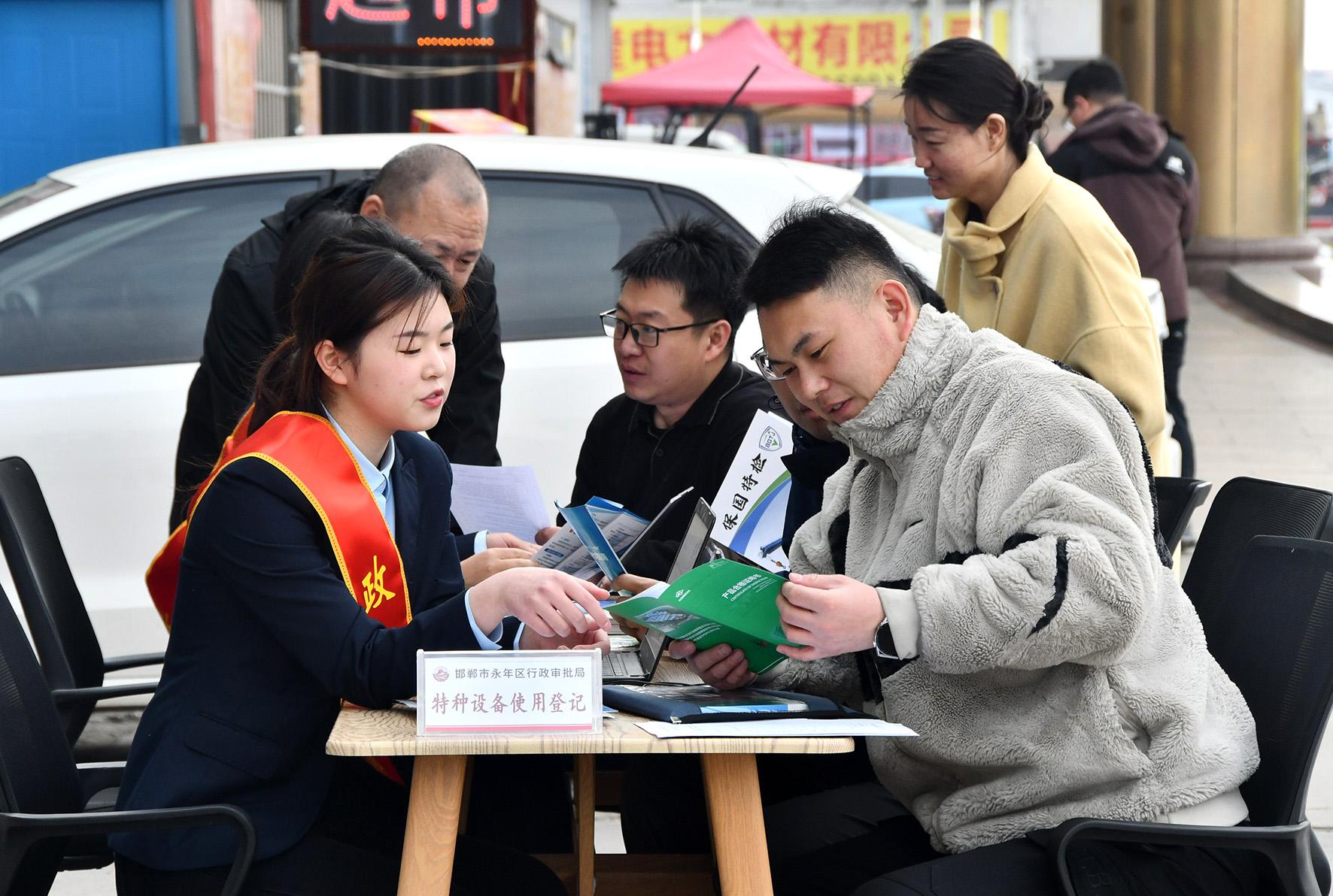 3月14日,河北省邯鄲市永年區(qū)行政審批局把政務服務“辦公桌”搬到企業(yè)群眾“家門口”,組織工作人員深入緊固件產(chǎn)業(yè)聚集區(qū),現(xiàn)場為企業(yè)和群眾集中辦理特種設備使用登記業(yè)務。