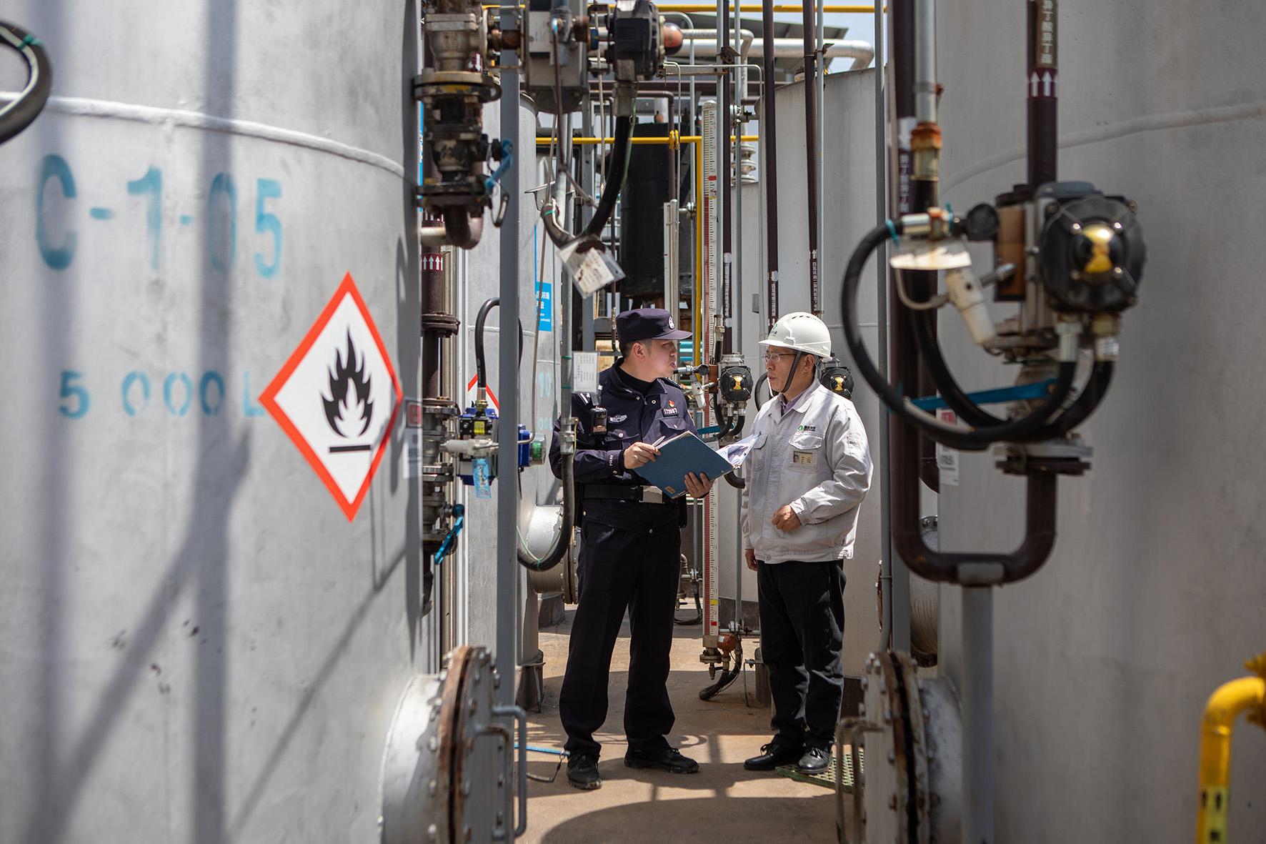 4月2日,浙江省臺州市公安局黃巖分局江口派出所民警輔警在一家制藥廠開展安全檢查。