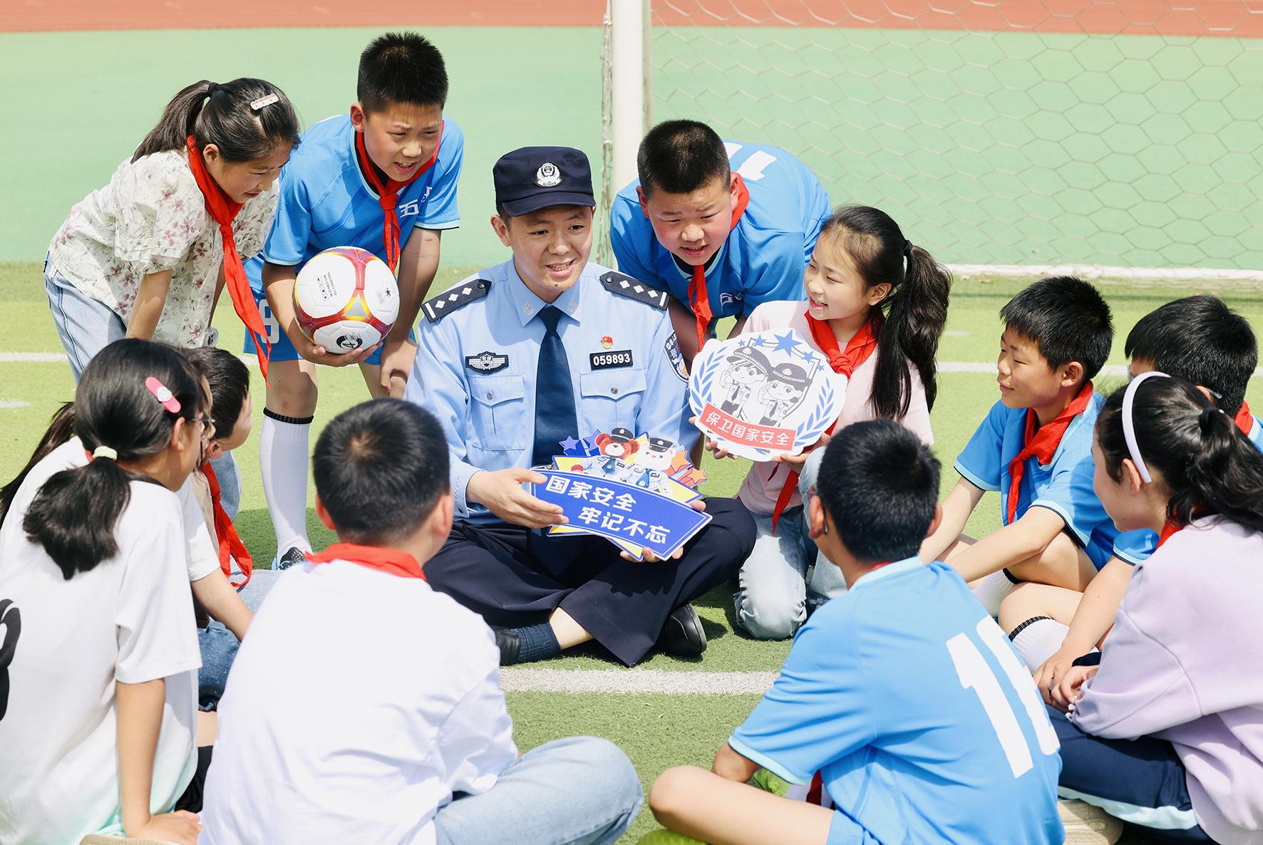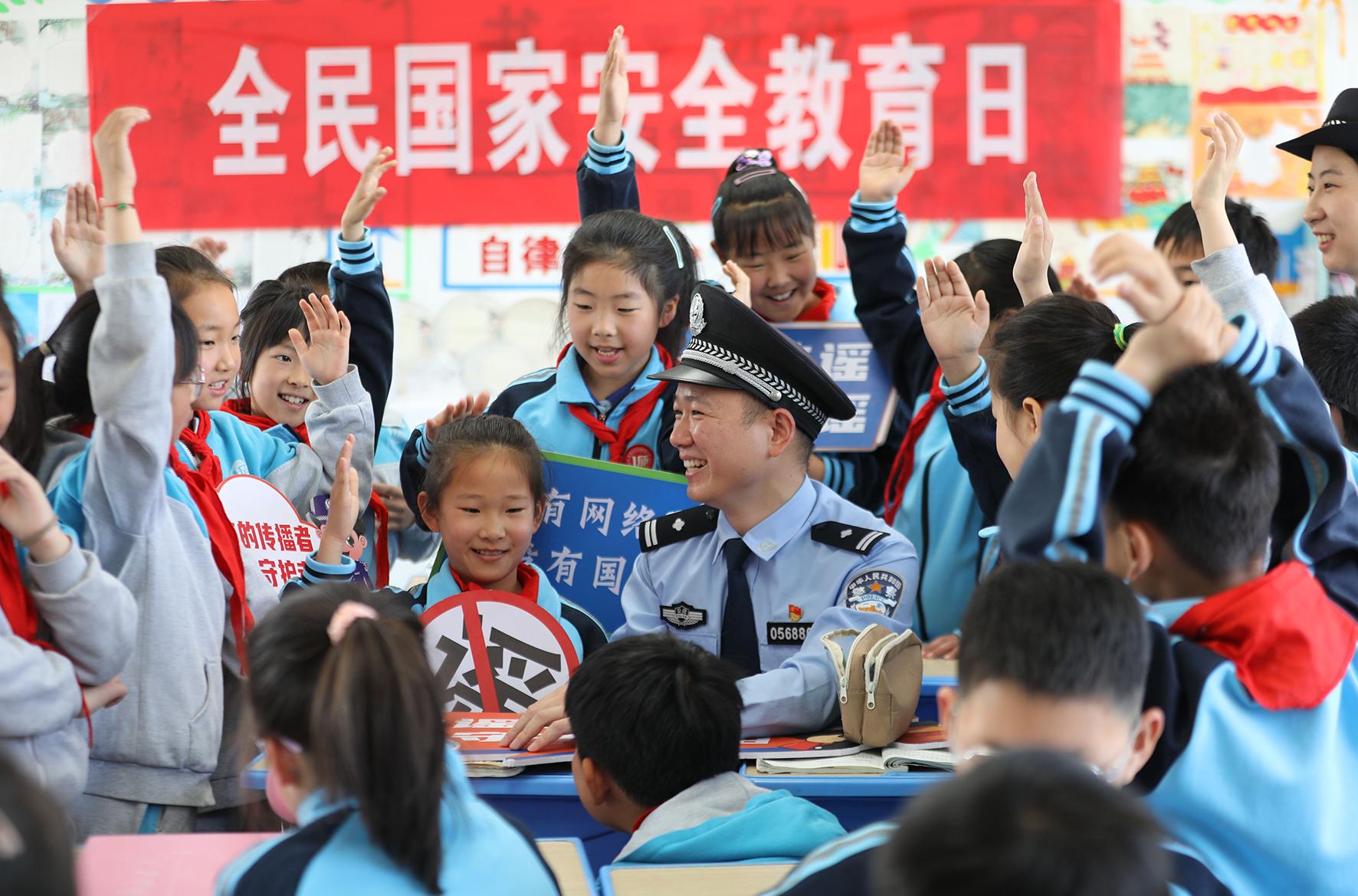 4月14日,山東省棗莊市公安局臺(tái)兒莊分局民警走進(jìn)明遠(yuǎn)實(shí)驗(yàn)小學(xué)開展全民國家安全教育日進(jìn)校園活動(dòng)。