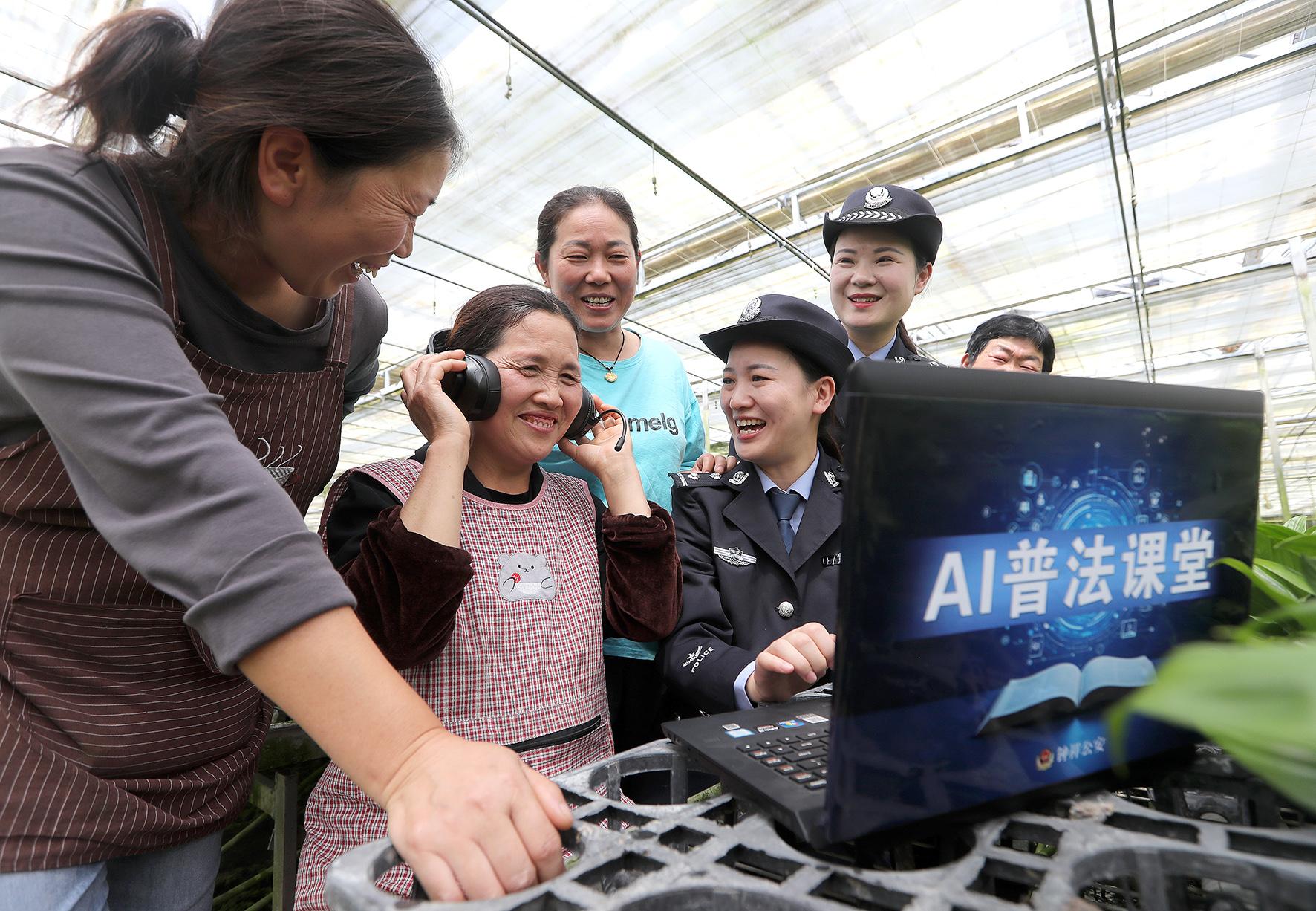 圖為4月15日,民警在柴湖鎮(zhèn)羅城村花卉大棚通過AI普法課堂進(jìn)行普法宣傳。
