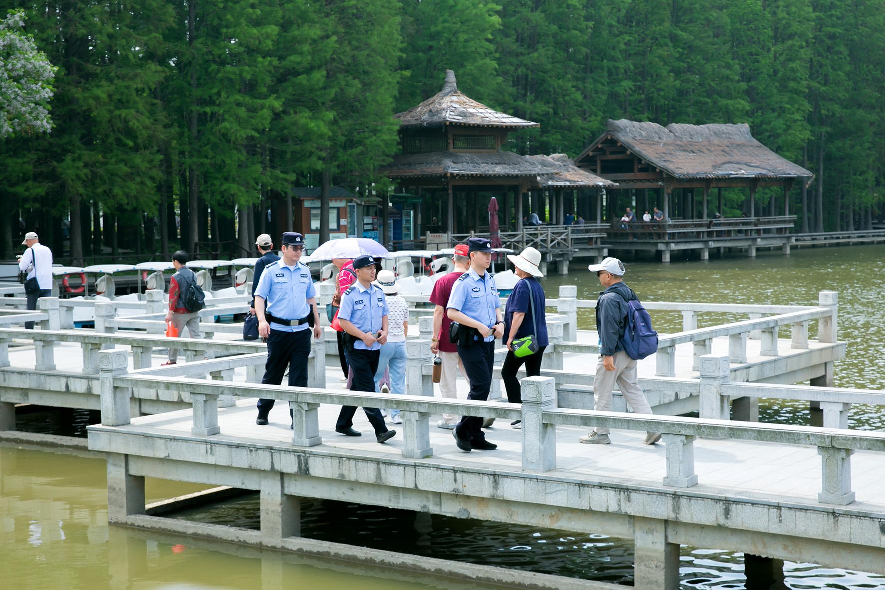 5月3日,河南省鄭州市公安局金水分局民輔警在轄區(qū)執(zhí)勤巡邏,服務(wù)游客。