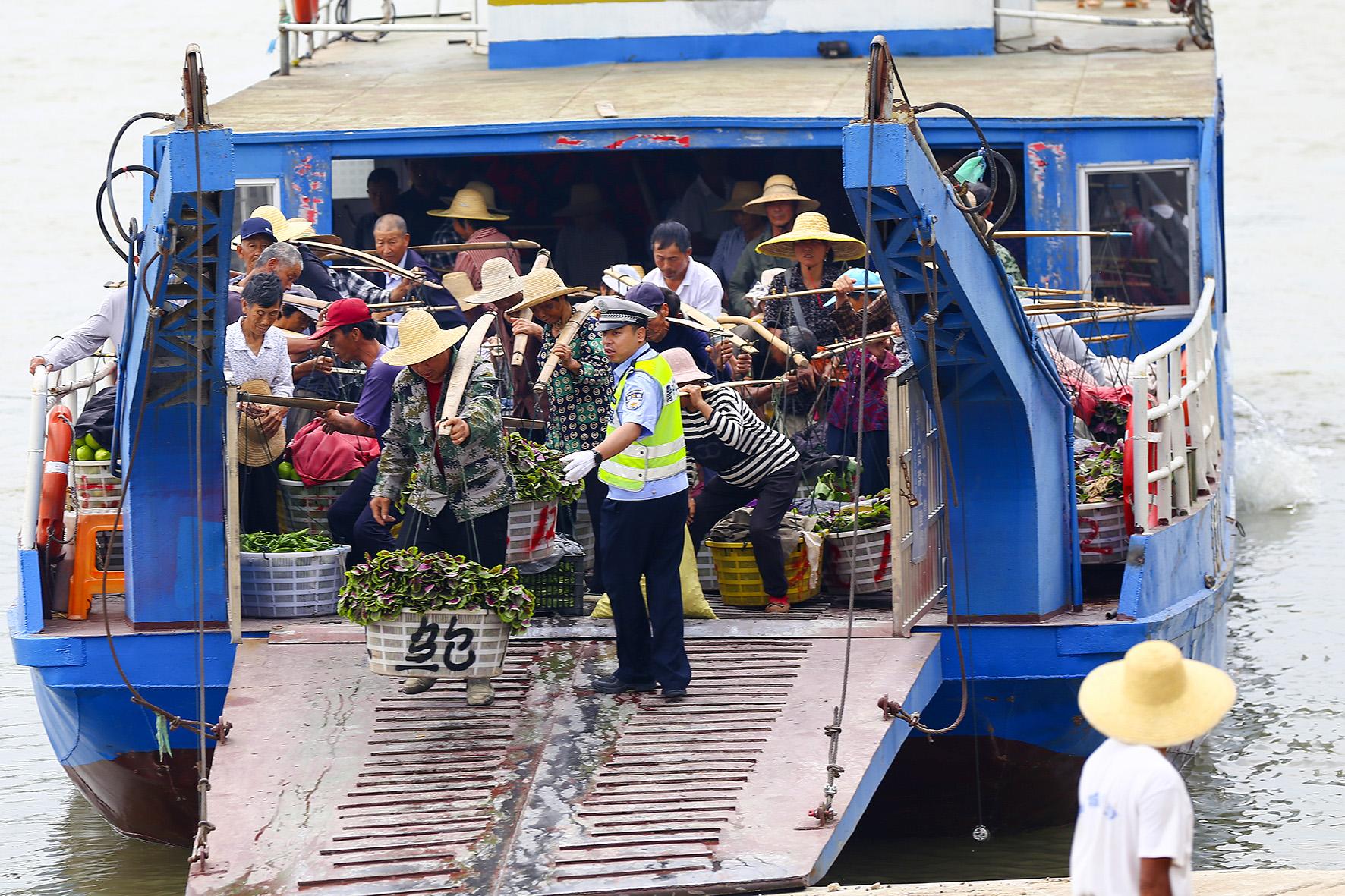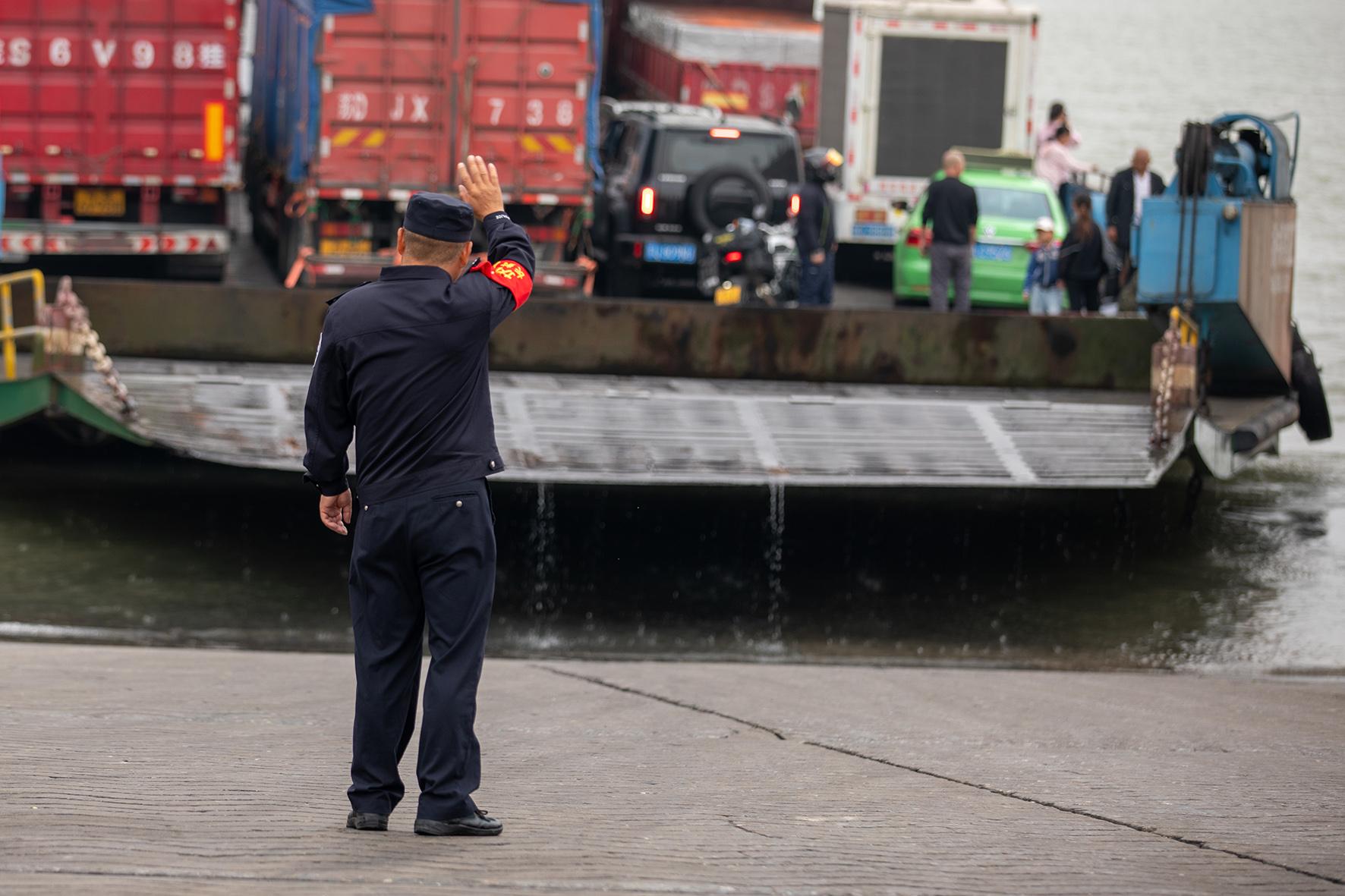 5月3日,安徽省銅陵市公安局交警支隊(duì)輔警堅(jiān)守在郊區(qū)大通古鎮(zhèn)與長(zhǎng)江江心洲之間的船運(yùn)渡口,保障江心洲上的菜農(nóng)運(yùn)輸蔬菜來往安全。