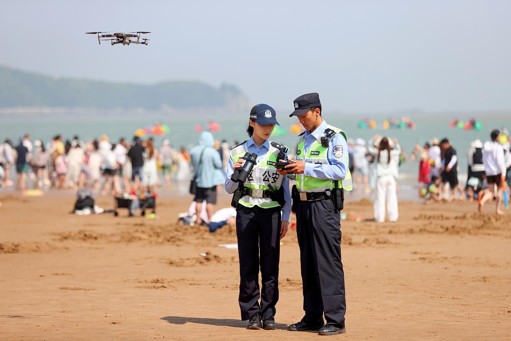 5月4日,浙江省舟山市公安局普陀山分局朱家尖派出所民警堅(jiān)守在轄區(qū)景區(qū)一線,開展巡邏執(zhí)勤、無人機(jī)空中巡查等工作,守護(hù)游客平安。