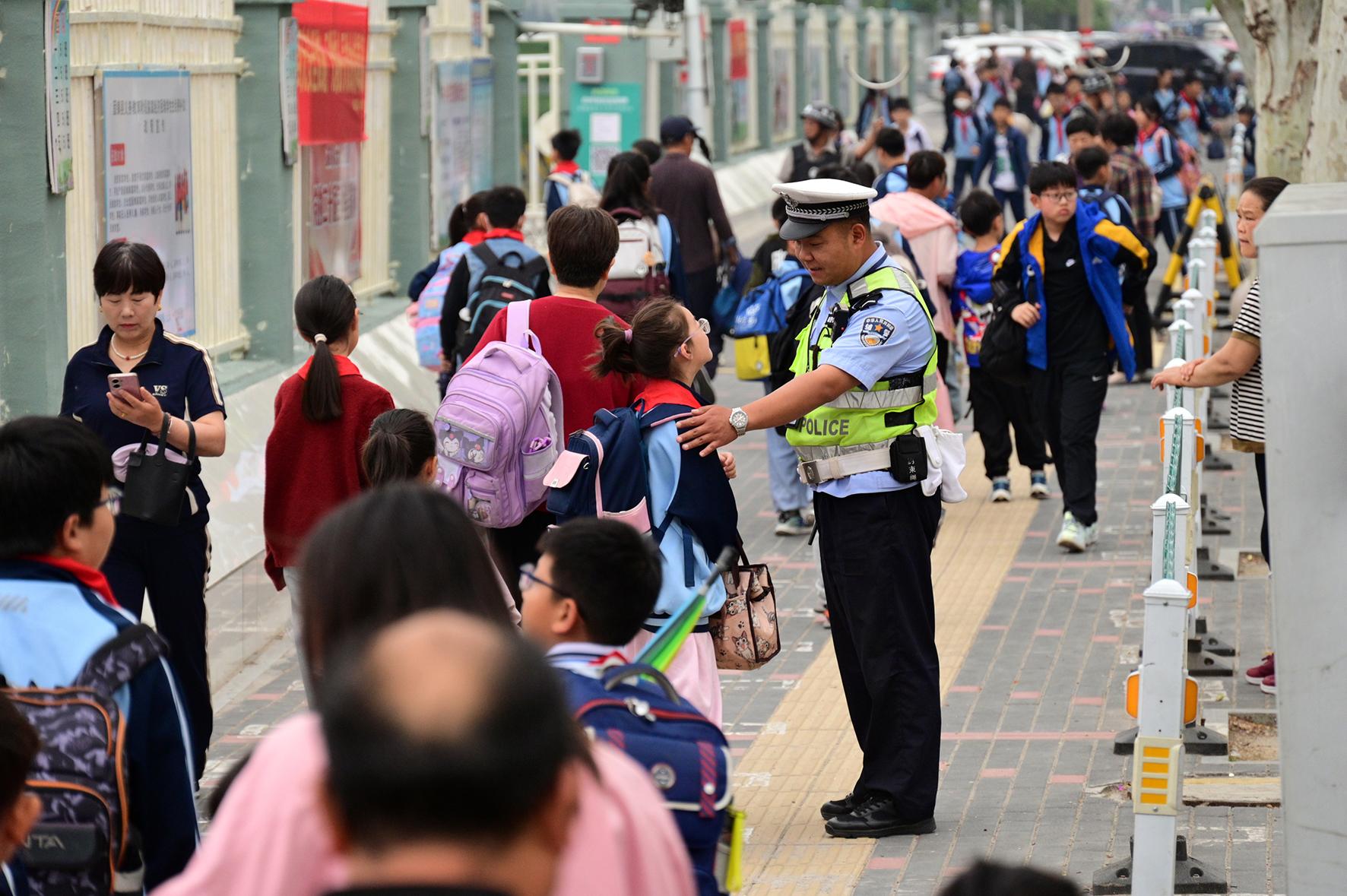 5月14日,安徽省固鎮(zhèn)縣公安局交管大隊輔警在澮河路第五小學(xué)路段指揮疏導(dǎo)交通,護送學(xué)生安全入校。