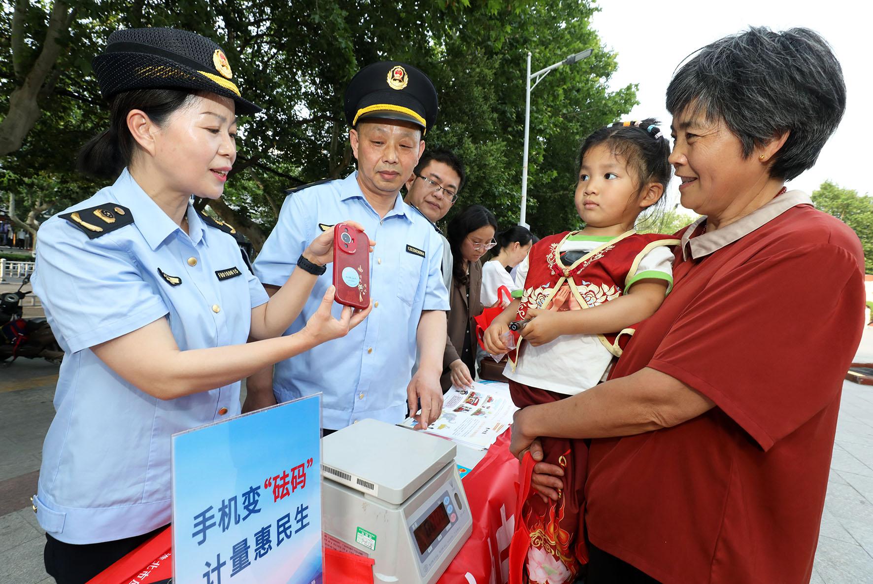 5月16日,在“世界計量日”到來之際,安徽省淮北市市場監(jiān)督管理部門在淮海路舉行“手機變砝碼 計量惠民生”電子計價秤防作弊科普宣傳活動。