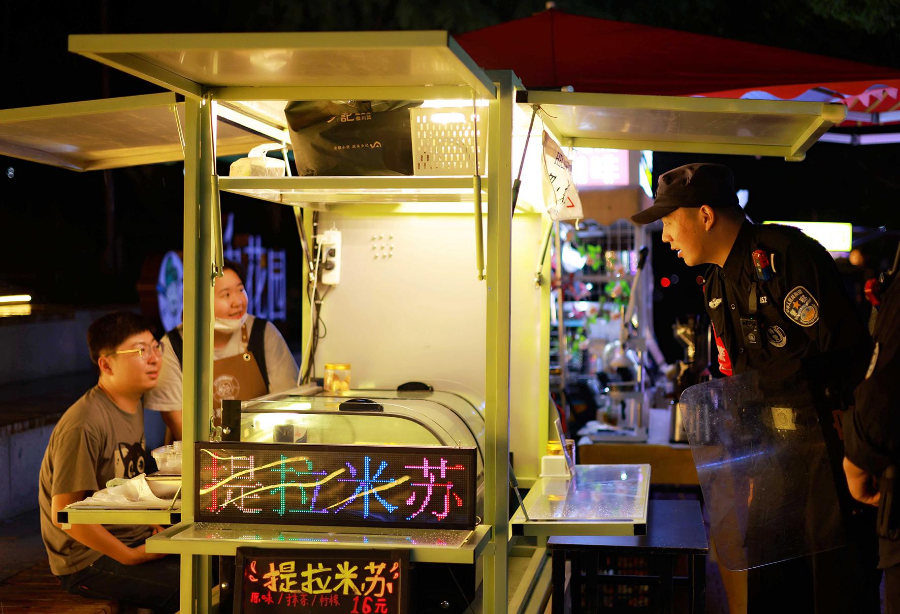 5月22日晚,安徽省馬鞍山市公安局特警支隊軍民路警務(wù)站民警輔警在軍民路小吃一條街開展巡邏和安全提醒。
