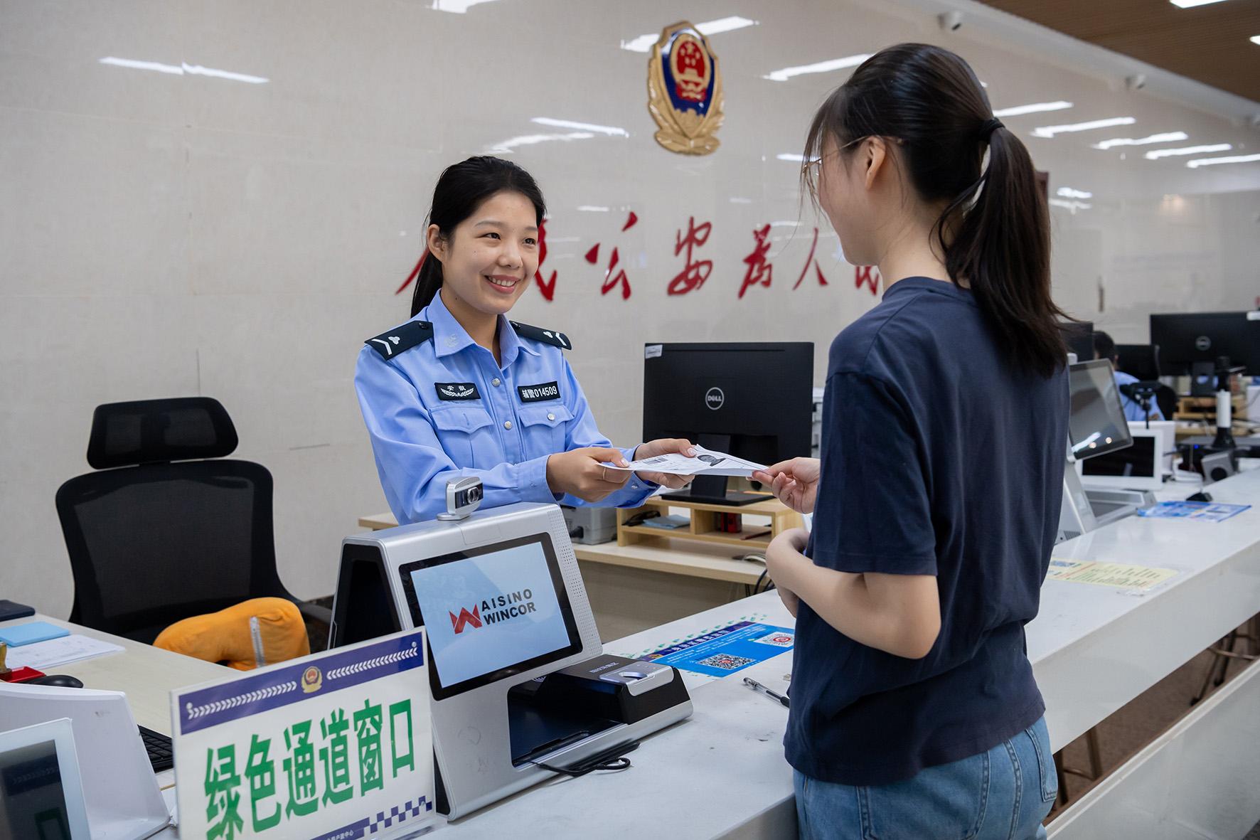 6月4日,安徽省合肥市公安局蜀山分局政務服務中心民輔警在考生“綠色通道”為考生辦理身份證件。