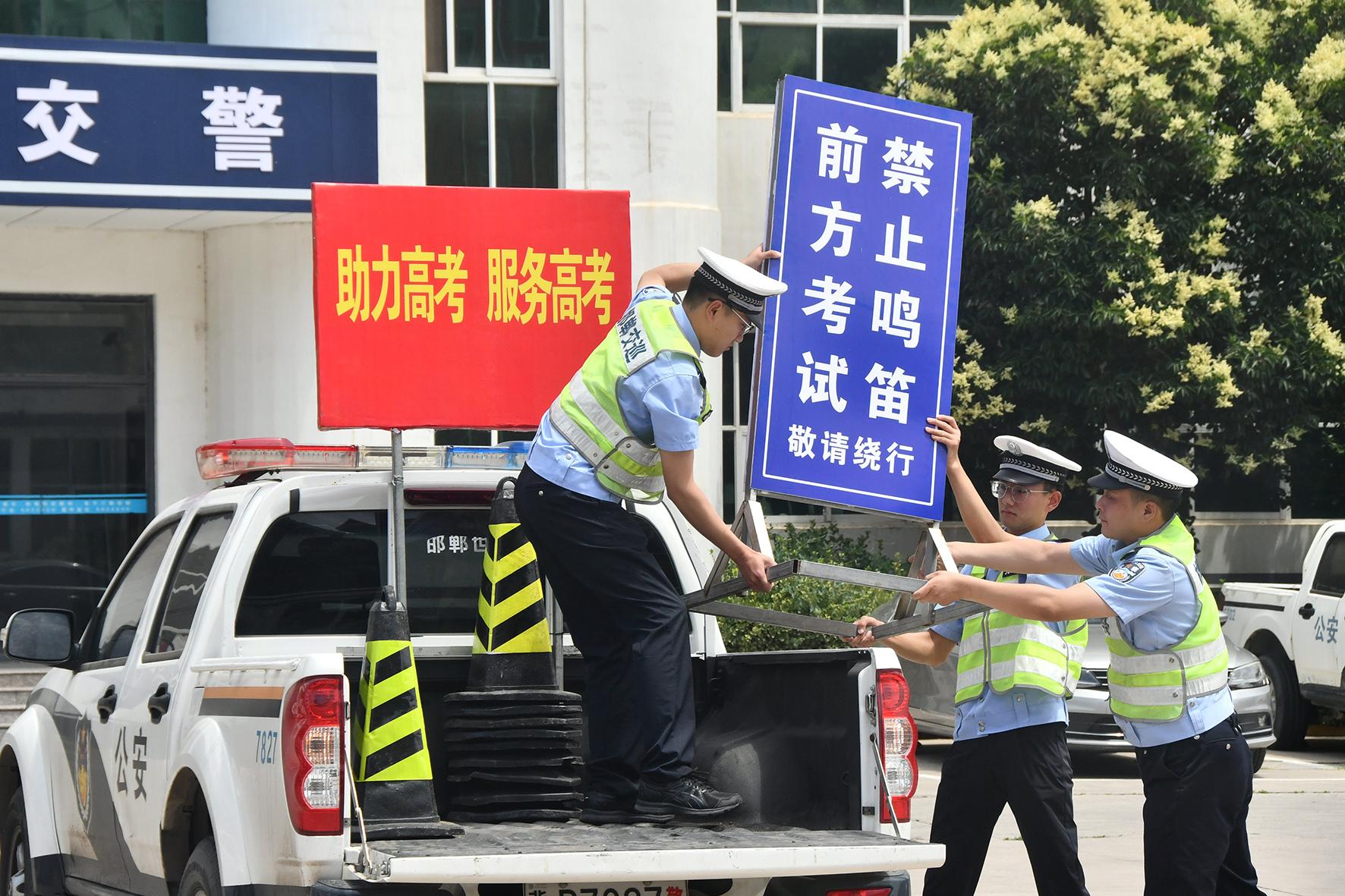 6月5日,河北省邯鄲市公安局交巡警支隊永年區(qū)大隊民警將高考相關交通標志牌裝車運往考場周邊路段。
