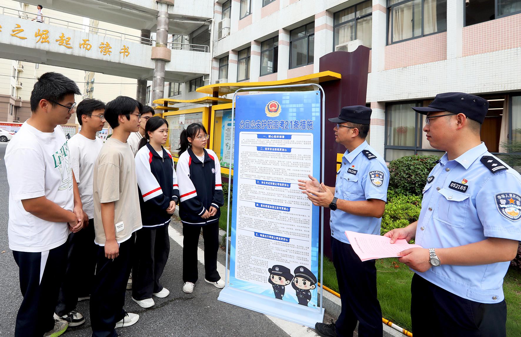 6月4日,江西省分宜縣公安局民警走進分宜中學向考生宣傳公安機關高考期間護考服務舉措。