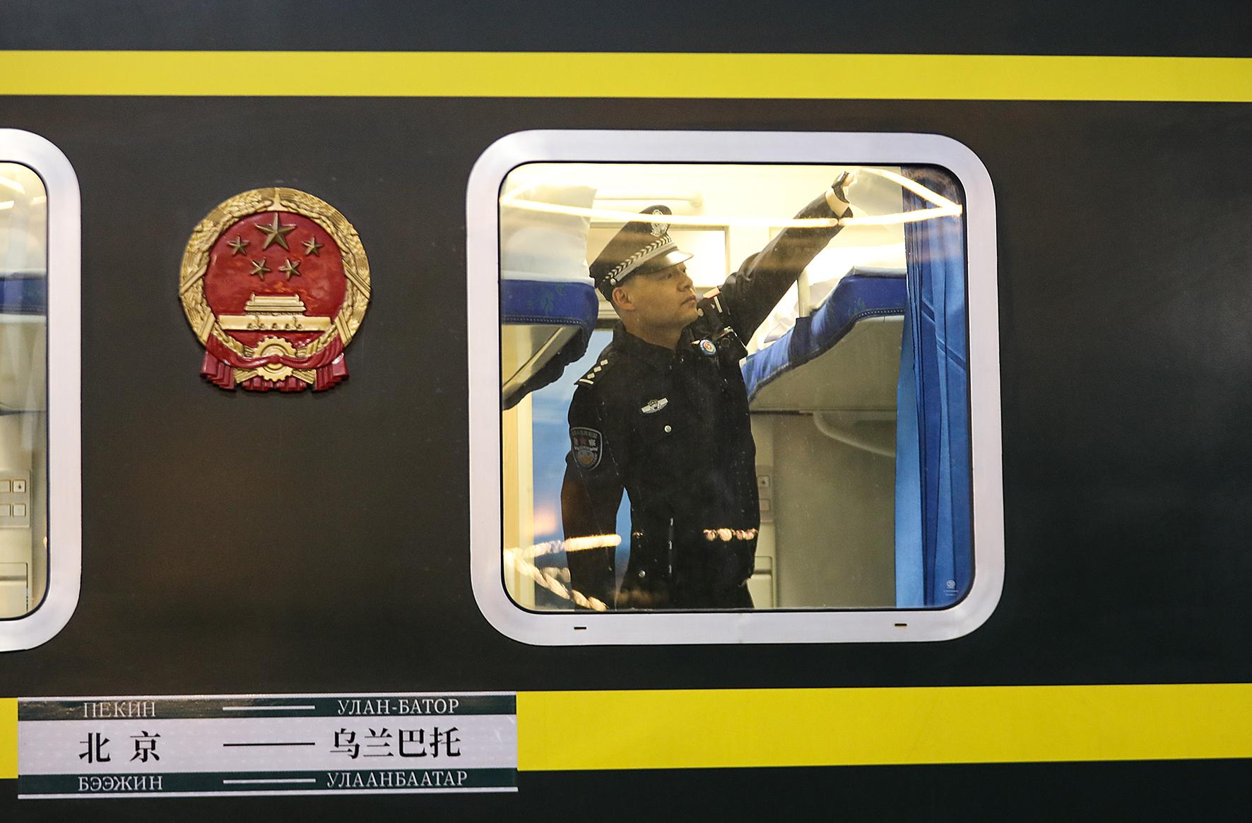 圖為二連出入境邊防檢查站移民管理警察正在查驗K23次國際旅客列車。