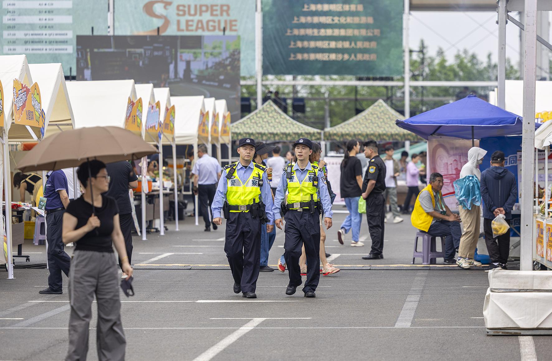 6月8日,上海市公安局崇明分局建設(shè)派出所民警在2025“一帶一路”國際籃球邀請賽賽場外進(jìn)行動態(tài)巡邏。