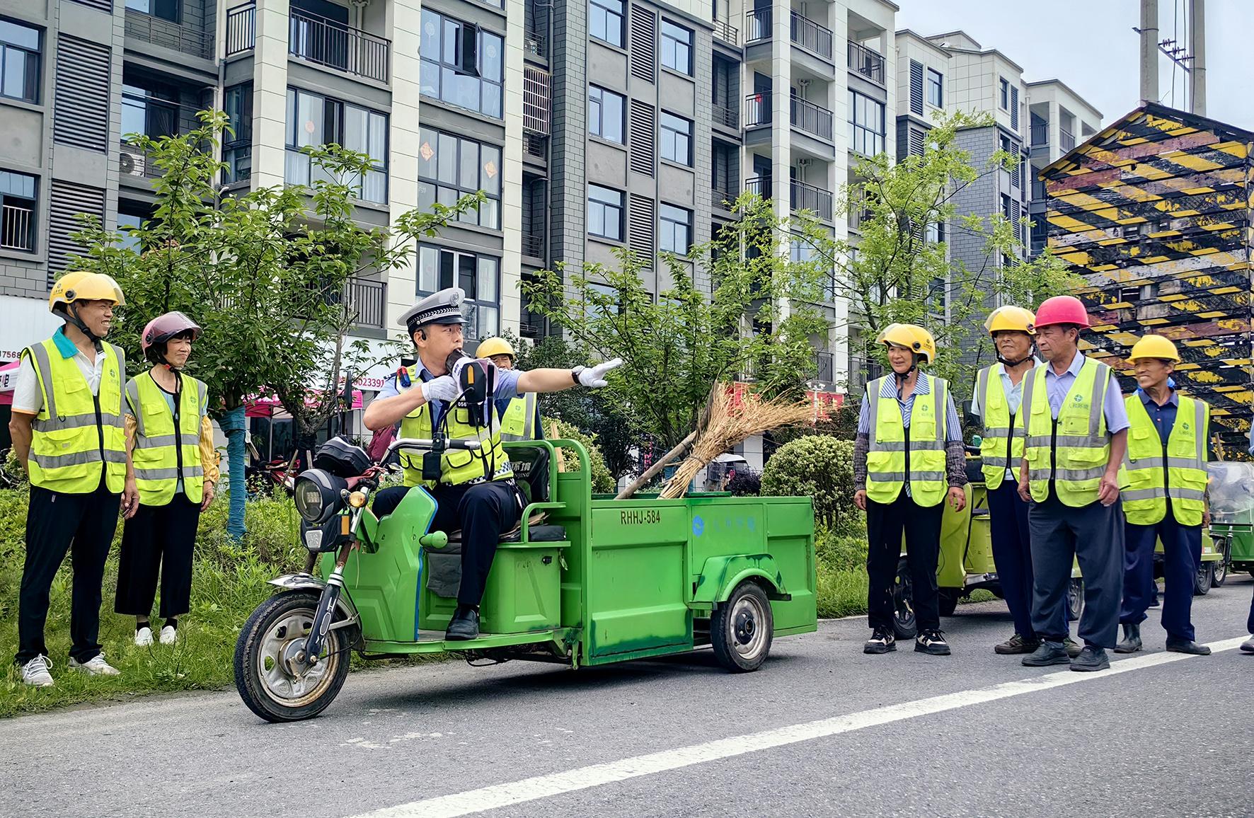 6月11日,安徽省舒城縣公安局交管大隊(duì)五顯中隊(duì)民警走進(jìn)五顯街道,向社區(qū)環(huán)衛(wèi)工人現(xiàn)場講解交通規(guī)則及安全防護(hù)知識(shí)。