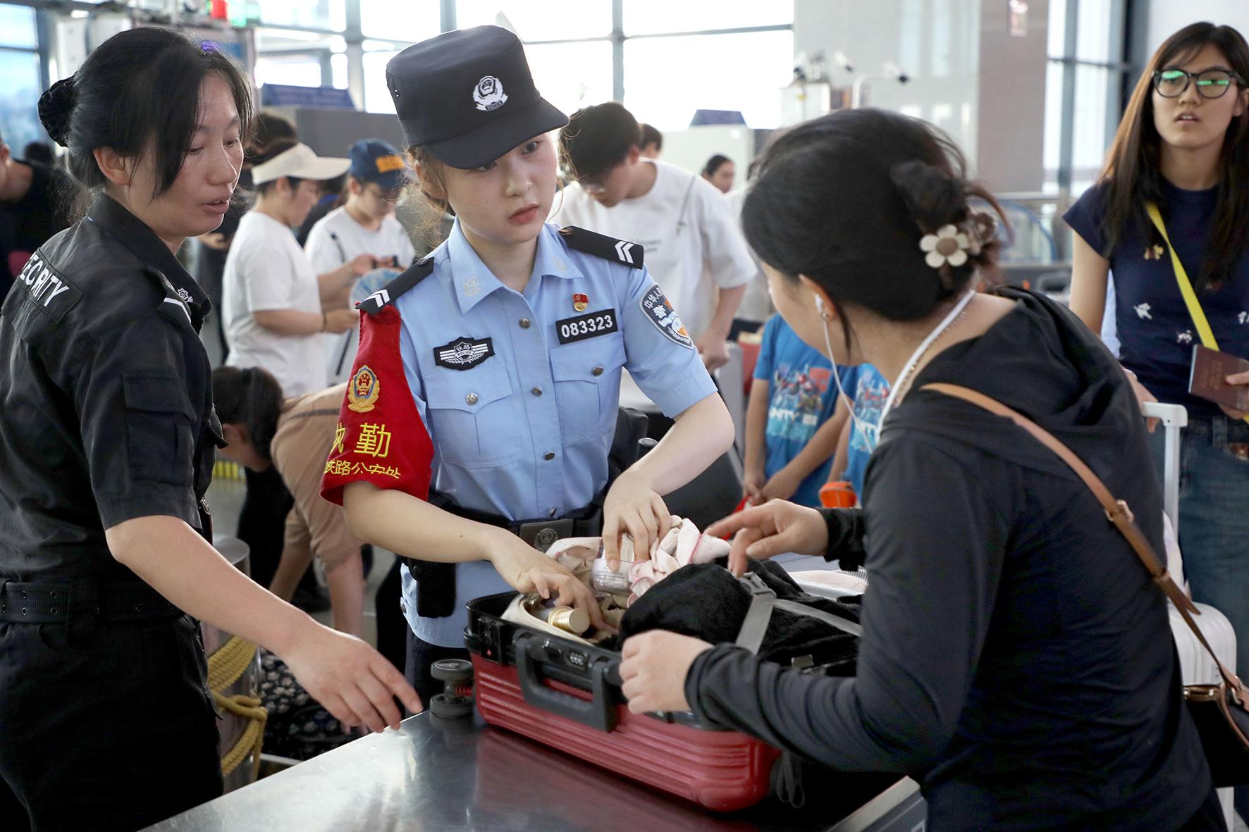 7月1日,上海鐵路公安局合肥鐵路公安處六安站派出所民警在對旅客攜帶物品進(jìn)行抽查。當(dāng)日,2025年鐵路暑運(yùn)拉開帷幕。合肥鐵路公安處六安站派出所通過科學(xué)調(diào)配警力、細(xì)化工作措施、宣傳法治知識等,為暑運(yùn)旅客平安出行保駕護(hù)航。